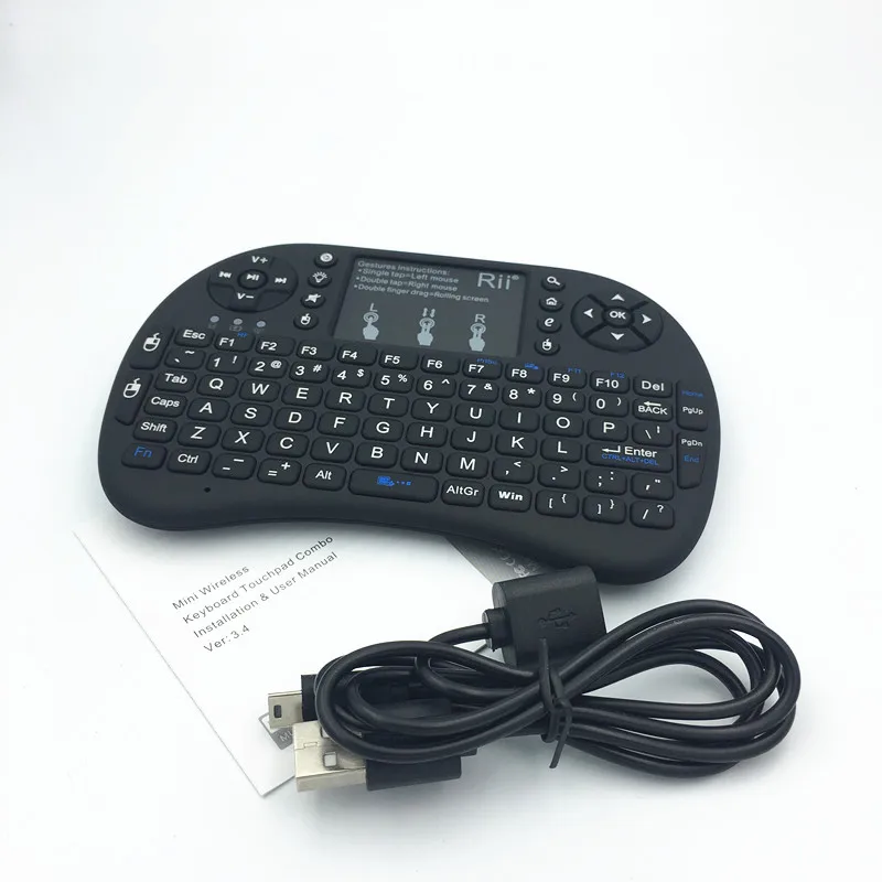 Мини-клавиатура i8 с английским мультимедийным пультом дистанционного управления тачпадом ручной с подсветкой для Android TV BOX Notebook Mini PC Характеристика: * Рабочий диапазон: 15 метров (макс.), без нарушения сигнала и без ограничения направления. * Диапазон частот: 2,403 ГГц ~ 2,480 ГГц • Рабочее напряжение: 3,3 V * Зарядка Напряжение: 4,4 V ~ 5,25 V * Модуляция: GFSK * Канал: 78 каналов * Мощность TX: менее + 5dBm * Скорость передачи: 1 м бит/сек * Допуск частоты: +/-30ppm * Энергопотребление: 55 мА (вкл.), 1 мА (спящий режим) * Тип батареи: встроенный литий-ионный аккумулятор * Размер изделия: 15*10*2 см * Вес изделия: 109 г * Размер посылка: 17*14,5*3,5 см