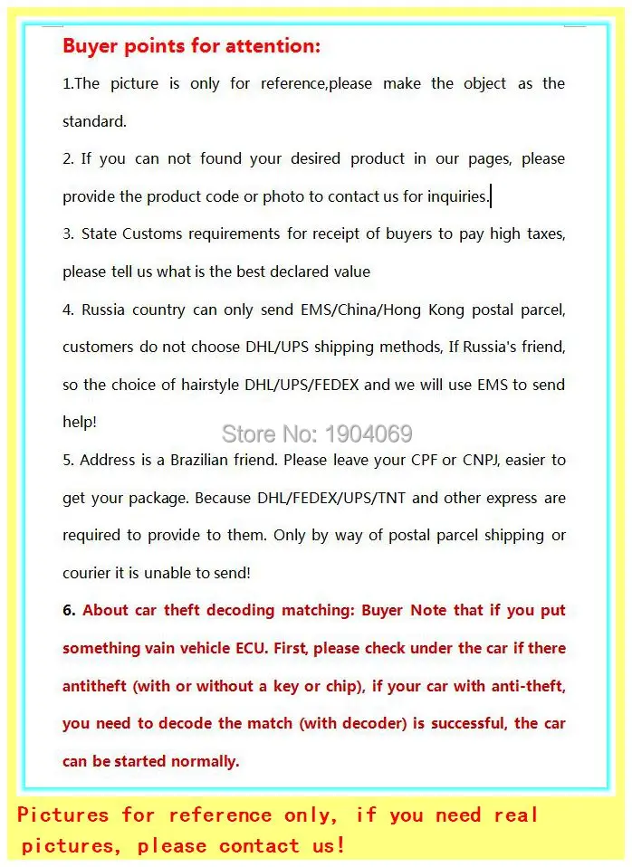 (9) если адрес-бразильский друг. Пожалуйста, оставьте ваш CPF или CNPJ, легче получить ваш пакет. Потому что DHL/FEDEX/UPS/TNT и другие Экспресс-службы должны предоставить им. Только путем доставки почтовой посылки или курьерской доставки посылка не может быть отправлена!