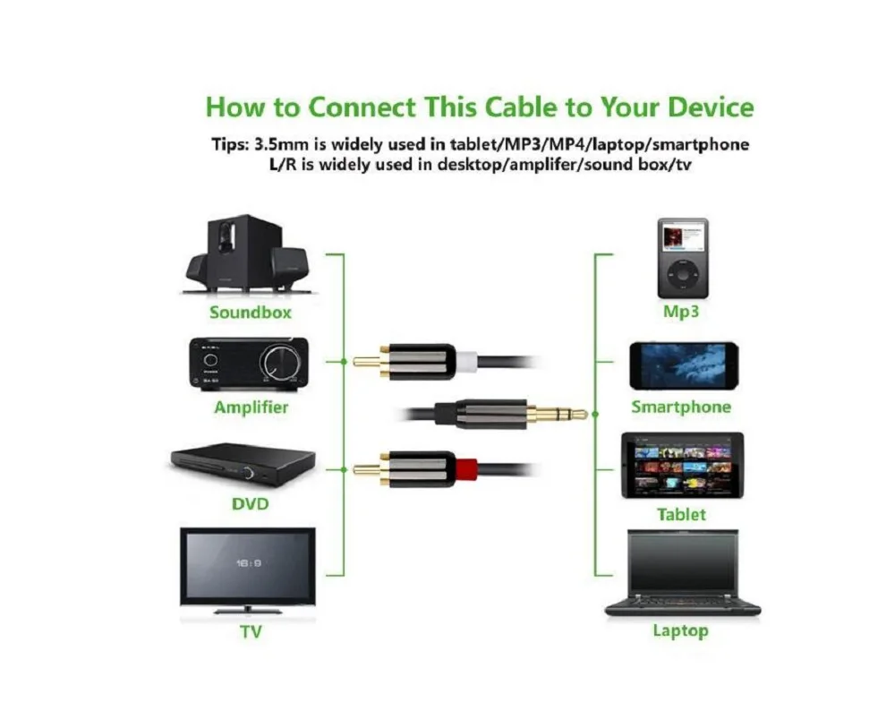 3,5 мм стерео до 2RCA кабель идеально подходит для подключения выхода вашего мобильного телефона, IPod, MP3 плеер, планшет или ПК к вашей домашней аудиосистемы, В то время как большинство мобильных устройств с помощью 3,5 мм стерео выход для наушников, большинство домашней аудиосистемы с усилителем или приемник использовать RCA разъемы для аудио входа.
