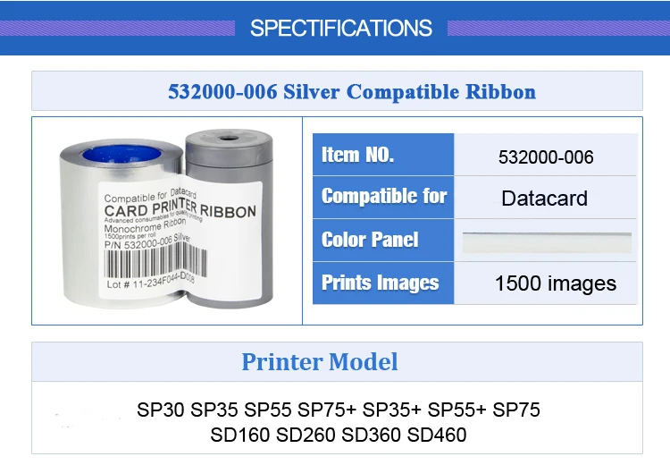 Отзывы о 2pcs/Lot Generic 532000-006 Silver Ribbon 1500prints for Datacard SP35plus SP75 SD260 FP65i Card Printer 552954-507 - купить по