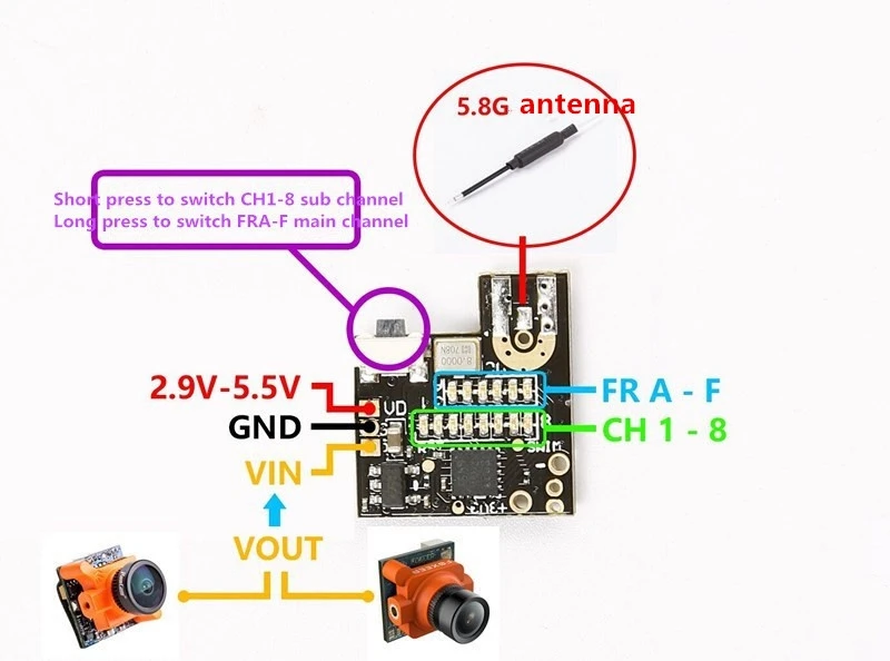 Частота: 5.8 ГГц Мощность: 25 МВт Частота: 48CH Вход напряжение: 2.9-5.5 В Вес: 1 г