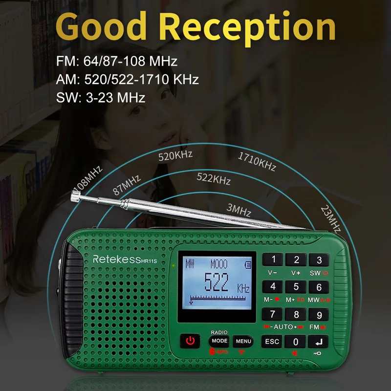 1. Хороший прием:HR11S коротковолновое радио с am fm, FM: 64/87-108 МГц, AM: 520/522-1710 кГц, SW: 3-23 МГц. Легко управлять и найти местную станцию. Длинная регулируемая антенна может обеспечить лучший прием.