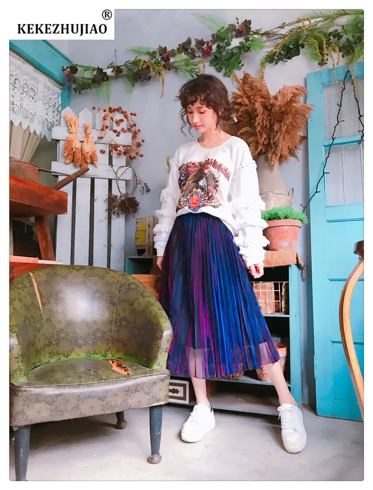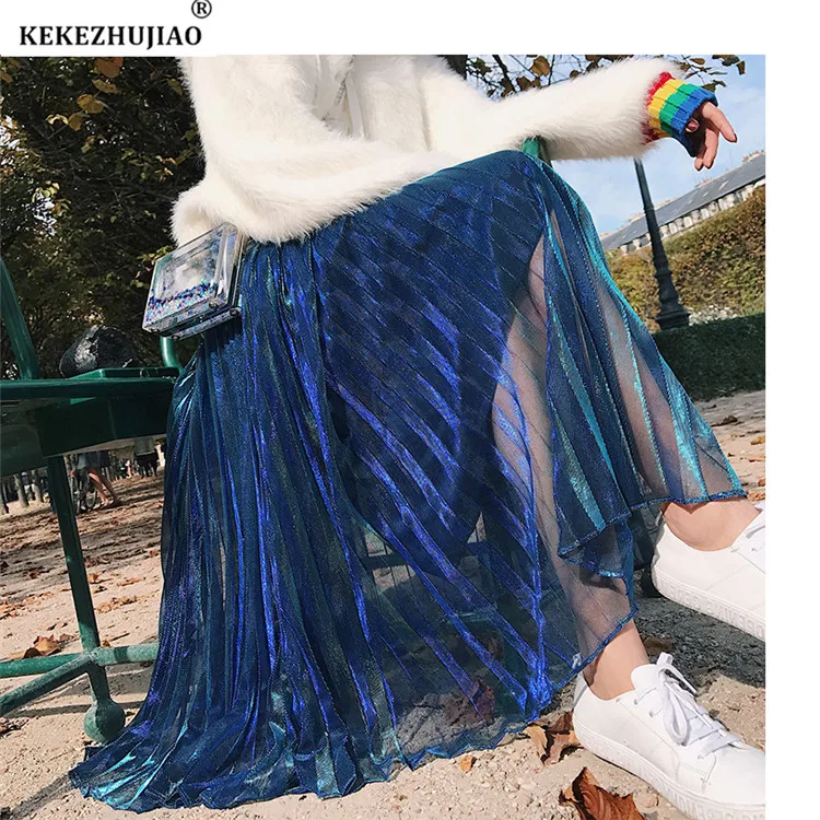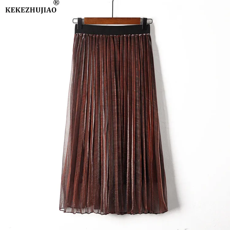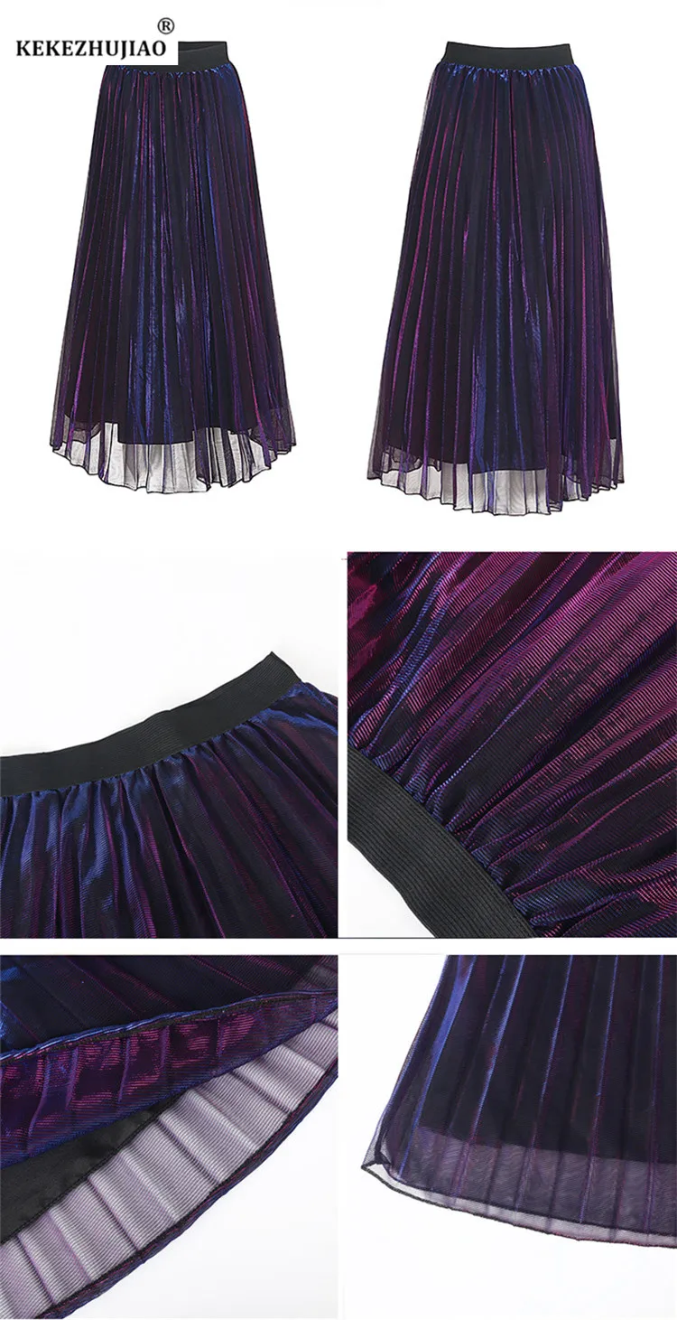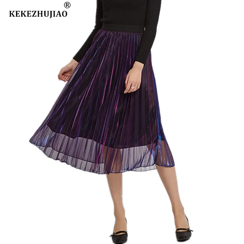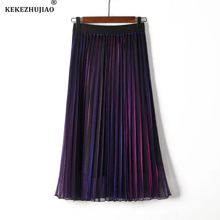 2018 Весенние длинные плиссированные юбки трапециевидной формы в стиле ретро с металлическим градиентом фиолетового цвета плиссированные юбки до середины икры с эластичной резинкой на талии