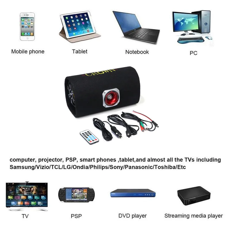 Артикул: Автомобильный Bluetooth бас 5 дюймов Динамик Максимальная мощность: 120 Вт Выходная мощность: 60 Вт Сопротивление: 4 Ом Частотный диапазон отклика: 20 Гц-20 кГц Напряжение: 12 В и 220 В Размер изделия: 30*15 см Инфракрасный пульт дистанционного управления U диск плеер/TF карты плеер/Встроенный Bluetooth функция Портативный Bluetooth Sub динамик бас Режим аудиовхода может быть подключен к компьютеру, MP3, телевизору, DVD и другим устройствам плеера. Басовый динамик подходит для электрического, мотоцикла, автомобильного автомобиля, компьютера, мобильный телефон, ноутбука. 5 5 дюймов динамик цвет: красный, желтый, Мы высылаем произвольным образом. Посылка включает в себя: 1 шт. x 5 дюймов Динамика сабвуфера (красный, желтый динамик цвет выбран наугад) 5 шт. х аксессуаров