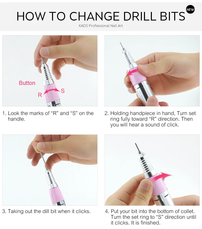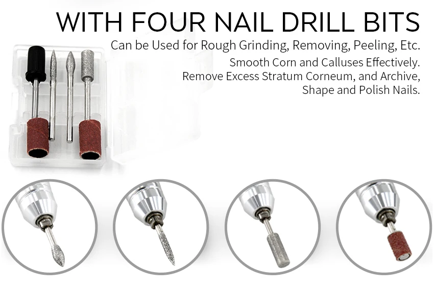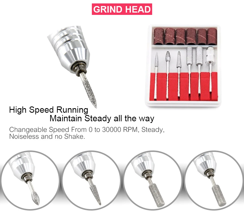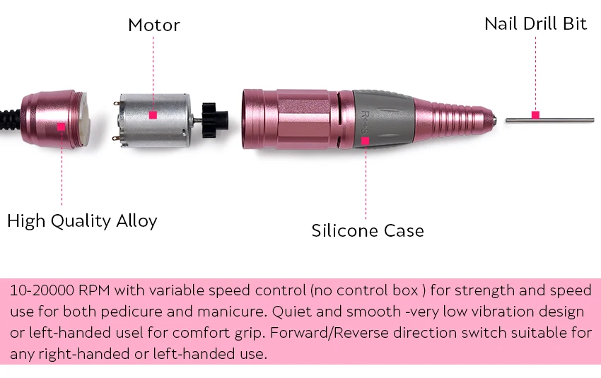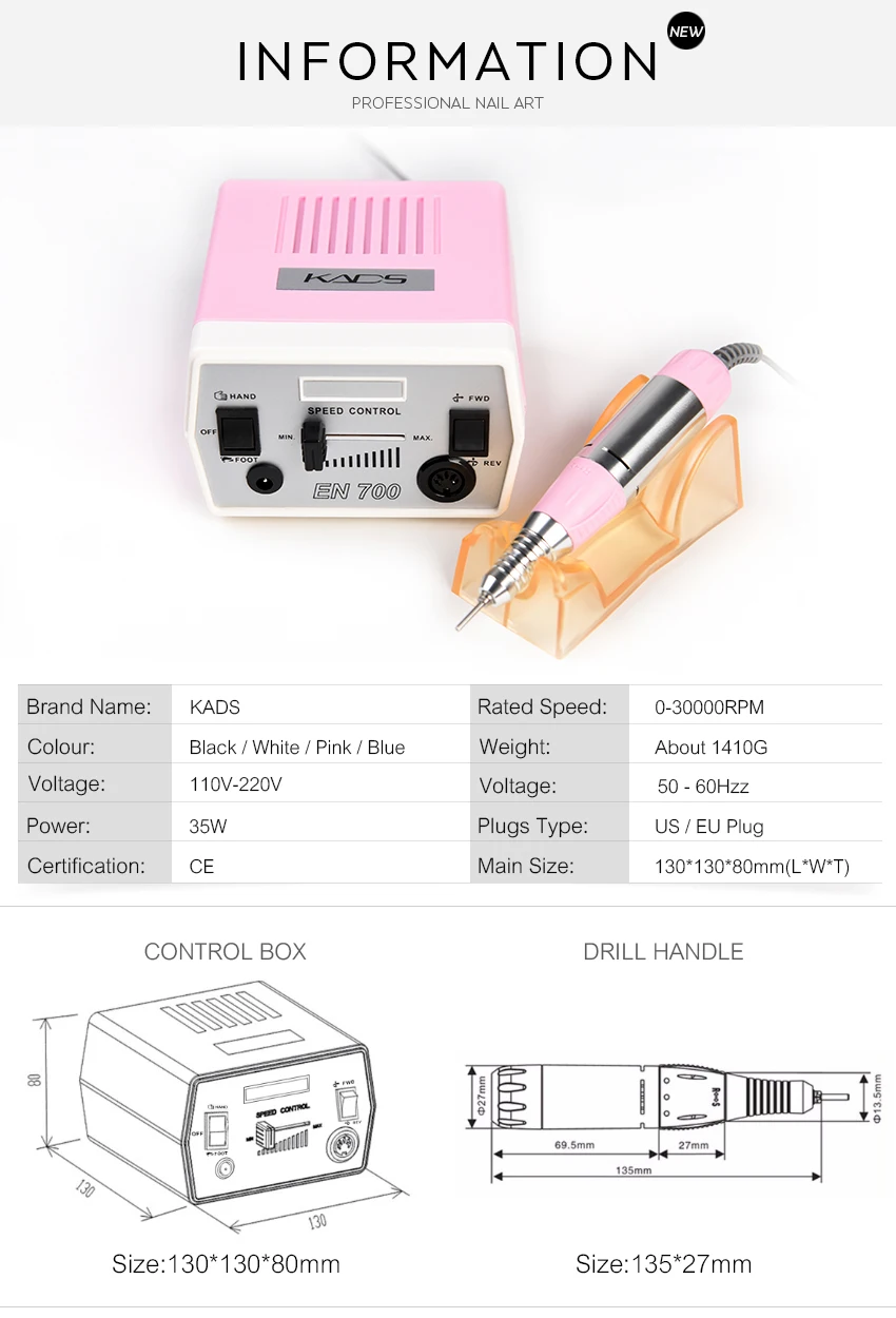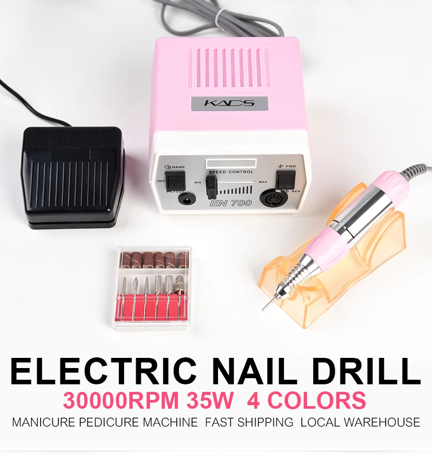 Особенности: -Простой в использовании контроль скорости. -Автоматическая система защиты от перегрузки -Светильник-ручка для удобного захвата и удобства в использовании -Включает 6 стандартных бит/головки для подачи документов -Для повседневного ухода за телом этот набор для маникюра и педикюра является идеальным дополнением. -Благодаря этим элементам вы можете легко и мягко обработать руки и ноги до уровня совершенства и элегантности. -Для педикюра и маникюра. -Подходит для профессионального использования, маникюрного салона или домашнего использования. Характеристики: -Цвет: розовый/синий/черный/белый -RayInput напряжение: 220 & 110 AC -Максимальная мощность: 35 Вт -Номинальная скорость: 0-30000 об/мин -Стандарт штепсельной вилки: штепсельная вилка европейского стандарта (220 В)/штепсельная вилка американского стандарта (110 В) -Размер главного контроллера: 130*130*80 мм (LxWxT) -Общий вес: 1410 г Посылка включает: -1 x электрическая дрель для ногтей (источник питания и контроль) -1 х наконечник -1 силиконовая подставка -1 х педаль управления питанием -6 сверл для шлифования металла -6 шлифовальных лент -Руководство пользователя-1 шт.