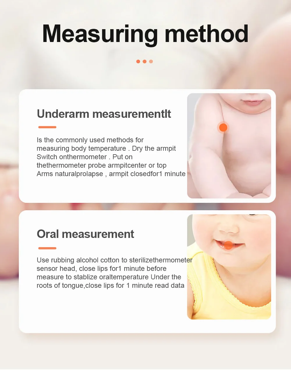 1: тестовое положение: подмышка/рот 2: Нажмите кнопку питания, он будет пищать и появится подсказочные символы 3: Поместите продукт в подмышку, температура устройства увеличивается 4: Продукт показывает последнюю температуру и держит 2 секунды 5: постоянная температура непрерывная 16 секунд 6: система автоматически выключается через 8 минут