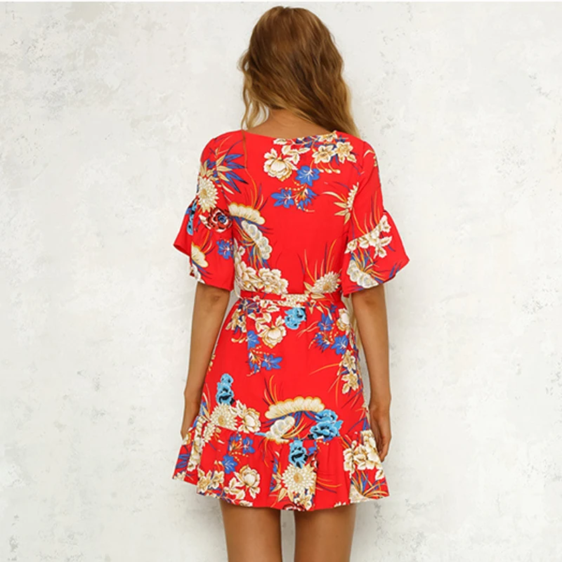 Женское летнее платье с рюшами на рукавах, мини-платье с цветочным принтом, обтягивающие пляжные платья в стиле бохо с поясом, уличная одежда Vestidos