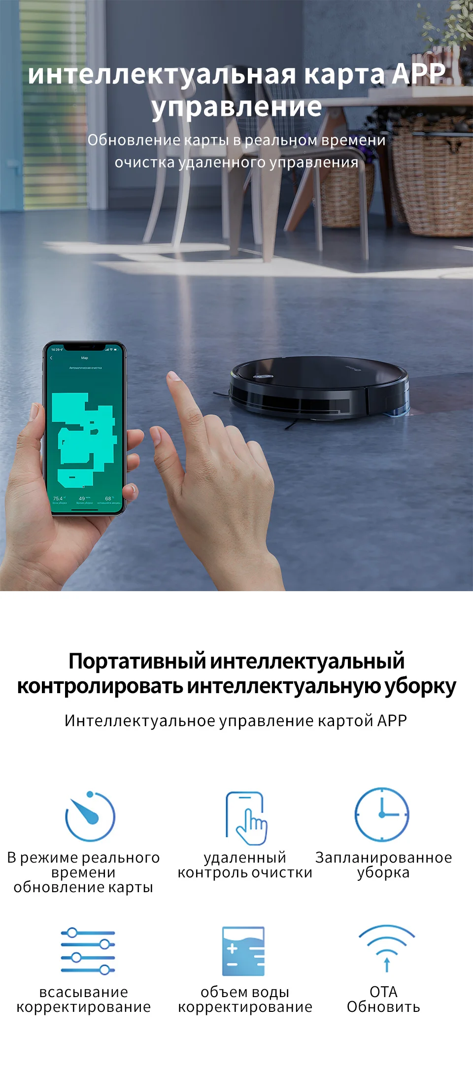 Пылесос оснащён функцией запоминания мест, где он убирался. Пылесос рисует карту помещения и отображает её в мобильном приложении. Таким образом, вы можете дистанционно оценить текущую уборку помещения.