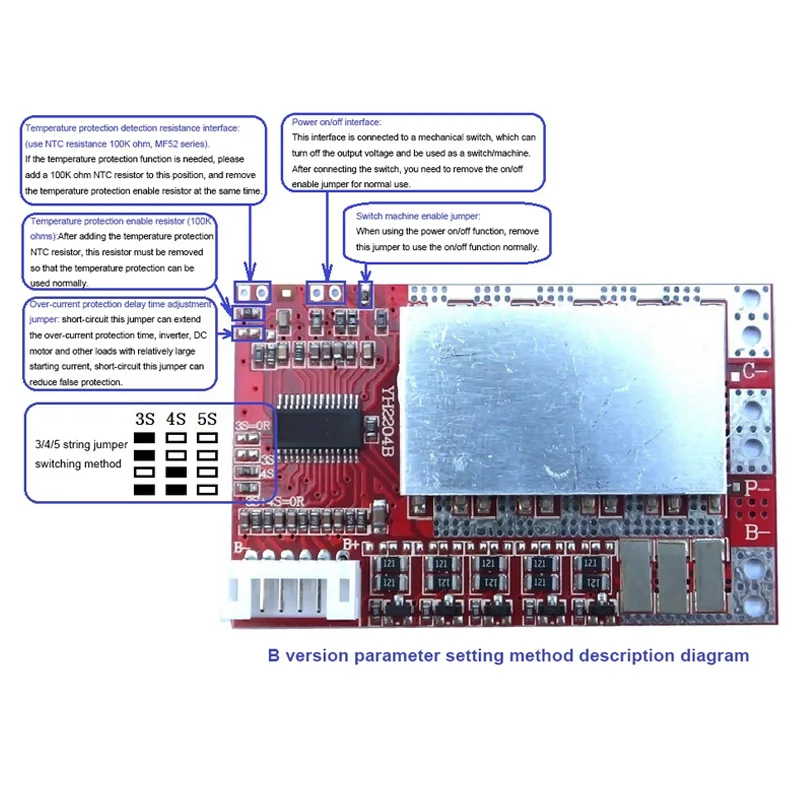 Особенности продукта: Плата защиты литиевой батареи использует высокоинтегрированную интеллектуальную плату защиты литиевой батареи, интегрированный чип, производительность лучше, чем Защитная панель, состоящая из дискретных чипов. Может завершить 3/4/5 струнный полимерный литиевый аккумулятор, тройной литиевый аккумулятор, литий-железо-фосфат, оксид литиевого кобальта, литий-марганцевый оксид, защита от заряда и разрядки, перегрузки по току, короткого замыкания, защита от перегрева и функция выравнивания. Он принимает 4 миллиом ультра-низкое внутреннее сопротивление MOS трубки, которая имеет низкое внутреннее сопротивление и высокую эффективность. Он подходит для применения в различных областях, таких как инверторы, двигатели постоянного тока, электроинструменты и уличные солнечные фонари. Обычно подходит для одного и того же рта и рта. Защитная панель имеет теплоотвод и линию подачи. Эта ссылка продает 4S по адресу defualt! Примечания: 1. Выберите соответствующую защитную панель в соответствии с фактическим типом батареи и серийным подключением. Плата защиты различных серийных номеров не может использоваться универсально. Плата защиты может переключить серийный номер батареи перемычкой. Для получения подробной информации см. Описание настройки параметров.2. Перед установкой платы защиты, батарея должна быть хорошо подобрана, и старые и новые батареи не могут быть смешаны.3. Пожалуйста, снимите кабель перед проводкой и подключите все провода, а затем подтвердите правильность проводки перед подключением кабеля. Когда проводка, схема управления проводкой постепенно подключается от отрицательного полюса батареи. Для толстой линии выберите соответствующий квадратный провод в соответствии с фактическим значением нагрузки.4. Когда рабочий ток слишком велик, добавьте олово в луженую часть передней и задней панели защитной платы или утолщите медный провод, чтобы увеличить возможности перегрузки по току печатной платы. В противном случае Медная Кожа на печатной плате будет led к току из-за чрезмерного тока. Кожа или ожоги.5, нужна функция защиты температуры, вам нужно добавить резистор 10K NTC (см. Описание). По умолчанию фабрика не имеет резистора для защиты от температуры.6. Эта Защитная панель имеет дополнительную задержку перегрузки по току. Если мгновенный пусковой ток нагрузки очень большой и приводит к неправильной защите, вы можете выбрать вторичную задержку защиты от перегрузки по току, чтобы уменьшить возникновение ложной защиты.![]()
