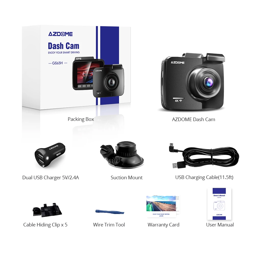 AZDOME Dash Cam для автомобилей поставляется с набором аксессуаров для дальнейшего улучшения его функций. Он также поставляется с набором из 5 пряжек для проводов для большего удобства. Помимо зарядного устройства Dual USB, крепления на присоске и кабеля питания, в комплект также входит инструмент для снятия обрезки. Внимательно ознакомьтесь с руководством пользователя, чтобы оптимизировать использование видеорегистратора 4K.