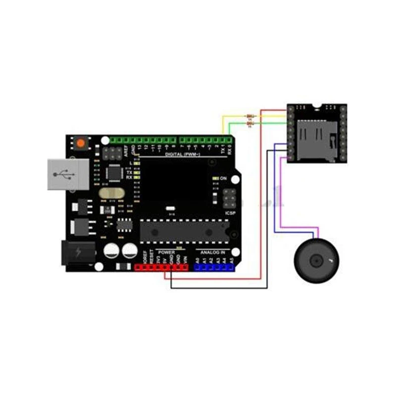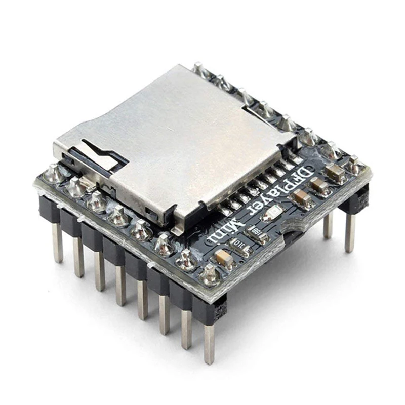 Product description Description: DFPlayer Mini is a compact MP3 form - inexpensive that can be connected directly to the speaker . module can be used alone with battery power, speaker, keyboard, or via the serial port as control For Arduino or any microcontroller with a serial port module. module features integrated hardware that can perfectly decode MP3, WAV, WMA. - Software supports TF card drivers to be compatible with FAT16, FAT32 file. You can use simple serial commands to carry out specified music player, music playback method - other functions. Without the underlying operation difficult, easy to use, very stable - reliable. specification: 1. Sampling Rate (KHz): 8/11 025/12/16 / 22.05 / 24/32 / 44.1 / 48 2.With the 24-bit DAC output, dynamic range: 90dB, SNR (signal to noise ratio): 85dB 3.Completamente compatible with FAT16 - FAT32 file system, supports TF card up to 32G, supports USB stick up to 32G, - NORGLASH to 64M bytes. 4.This various control modes. IO control, serial port, AD mode control button. 5.Using voice notification feature. It can pause playing music to make notification - after notification, can resume playing music. 6. The audio data are sorted into folders, supports up to 100 folders, each folder can contain 255 tracks. Page 7, With volume adjustment feature 30 levels, with 6 EQ levels to adjust. Application: 1 . voice navigation Transmission Car 2. Road Transport Inspection, voice notification for toll stations 3. Voice Notification safety inspection train - bus 4. Voice Notification finance operating room, electricity or communication 5. Voice notification of vehicles for entry - exit the tunnel 6. Voice Notification for border tunnels