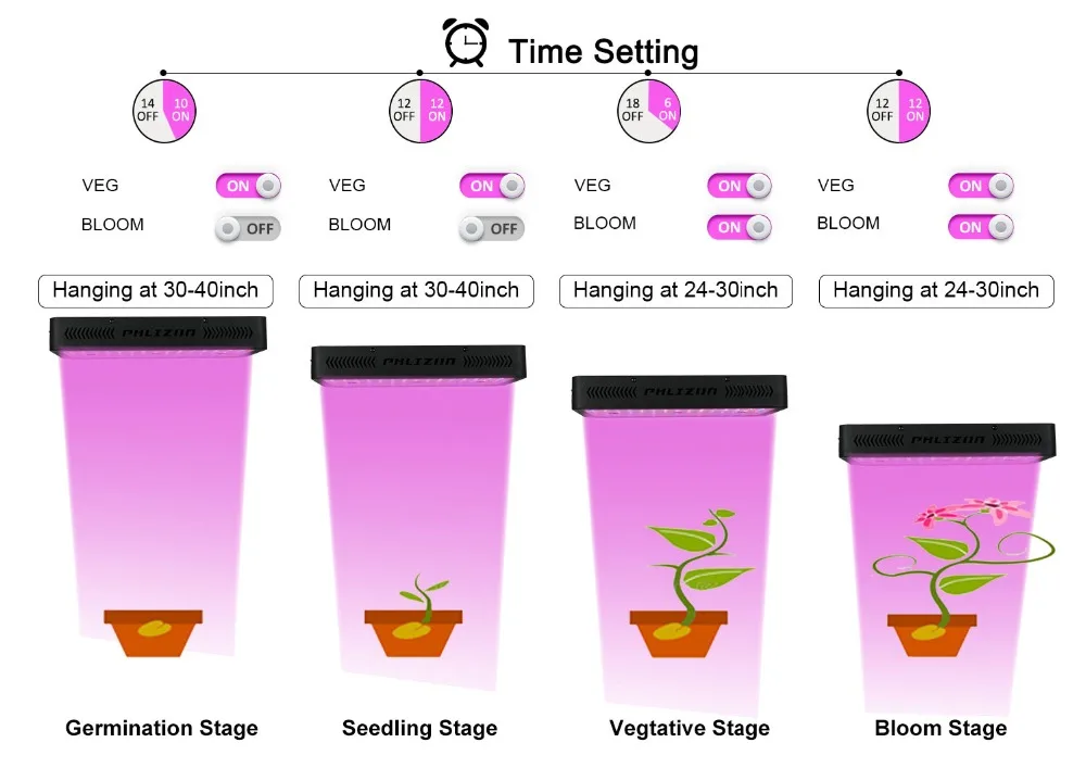 Растения нуждаются в различном количестве светильник на различных этапах цикла роста. Вы можете контролировать интенсивность, изменяя высоту светодиодов над растениями.