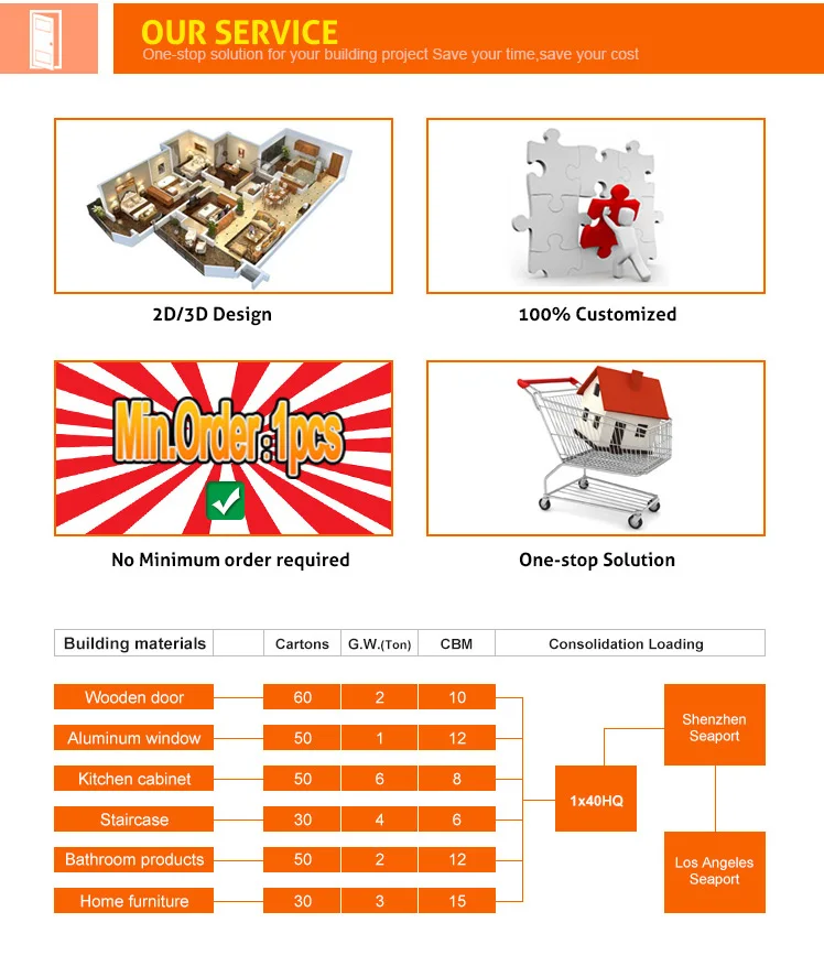 Мы предоставляем комплексное решение для строительных проектов в США, Австралии, Европе, Ближнем Востоке и Африке. Наши главные продукты: алюминиевые окна, деревянные двери, кухонные шкафы, лестницы, продукты для ванной комнаты и мебель для дома. Все они могут быть настроены в соответствии с вашими требованиями. Бесплатный дизайн будет сделан перед размещением заказа.