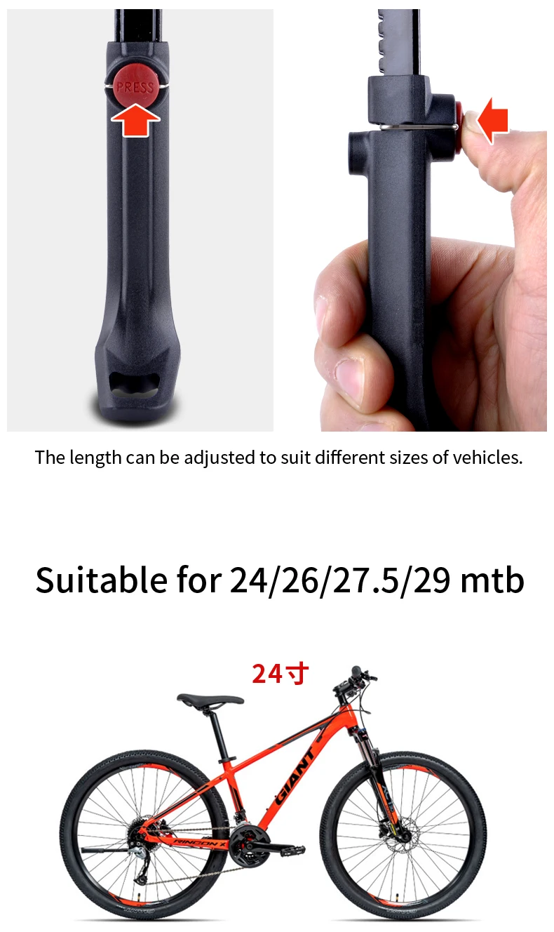 1. Эта велосипедная Подножка-универсальная модель, подходит для велосипедов размером 24-29 дюймов, длину можно быстро регулировать без инструментов.