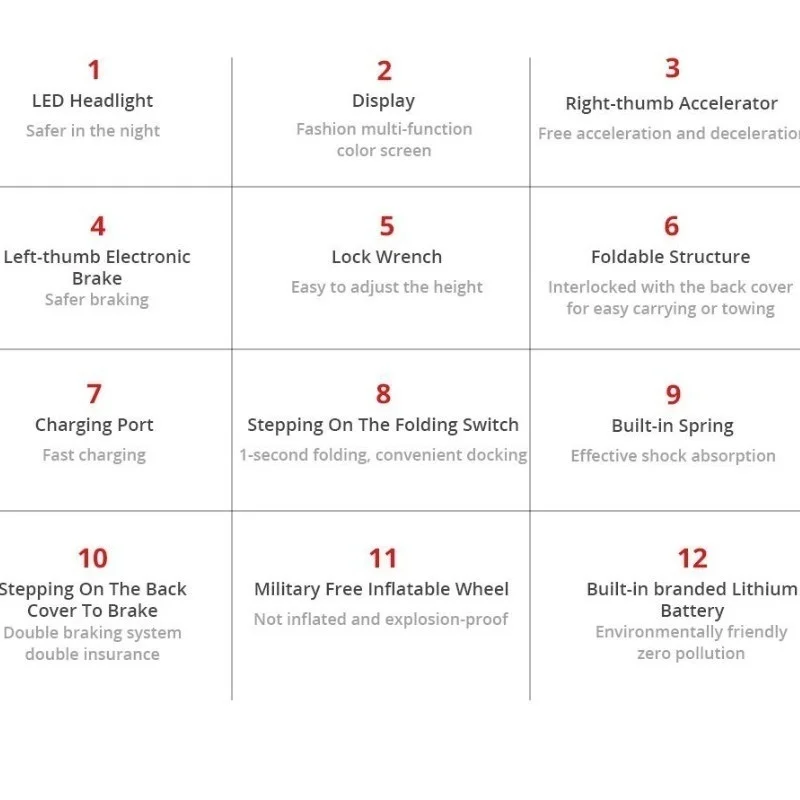 | Артикул: | Режим скорости: 15 км/ч; 25 км/ч; 35 км/ч Аккумулятор: 18650 литий-ионный аккумулятор Макс. расстояние: 30 км (зависит от веса дороги и водителя) Максимальная скорость: 35 км/ч Максимальная нагрузка: 120 кг Свет: передняя лампа, задний фонарь Допустимый градиент (зависит от вашего веса): 15 градусов Батарея Ёмкость: 6AH Напряжение батареи: 36 В Тип двигателя: бесщеточный двигатель постоянного тока Номинальная мощность двигателя: 350 Вт Макс. Скорость вращения двигателя: 700р/мин Номинальное напряжение двигателя: 36 В Максимальный крутящий момент: 13,3 Н. м Время зарядки: 4 ч Водонепроницаемый: IP54 Градиент скалолазания: 15 градусов Размер колеса: 8,5 дюймов сплошная задняя противоскользящая шина Расстояние торможения: 4 м |