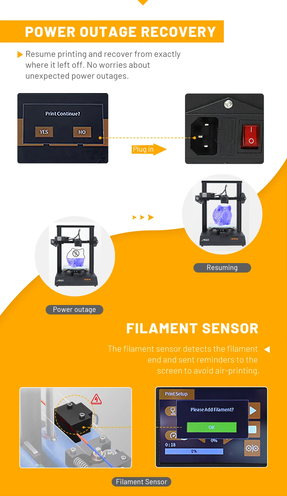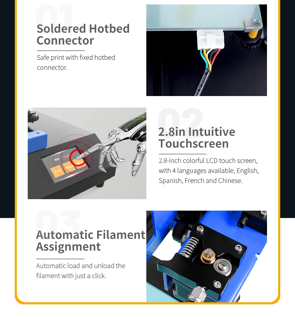Anet ET4-это цельнометаллический 3D-принтер FDM, изготовленный из 32-битной материнской платы промышленного класса и поставляемый в основном в собранном виде. Он поддерживает автоматическое выравнивание, возобновление печати и обнаружение нити и имеет более стабильную и компактную конструкцию. ET4-это профессиональное решение для 3d-печати, которое вы можете себе позволить. 【 A4988 шаговый трансформатор 】 [Автоматический уровень кровати] автоматическое выравнивание освобождает вас от трудоемких и трудоемких задач по выравниванию. 【Восстановление отключения электроэнергии 】возобновить печать и восстановиться именно там, где она осталась. Не беспокойтесь о неожиданных отключениях электроэнергии. [Детекция нити] филаментное обнаружение, которое обнаруживает конец нити и отправляет напоминание, чтобы избежать воздушной печати. [Автоматическое назначение нити] автоматическая загрузка и выгрузка нити одним щелчком. [Собирается в кратчайшие сроки] благодаря модульным конструкциям вы сможете быстро собрать ET4 при первой попытке за 10 минут. [Встроенная модульная конструкция] интегрированная модульная конструкция с клеммной штырьковой панелью для подключения портов, проводов с покрытием и более гладкий внешний вид. [Разработан с безопасностью в мышлении] материнская плата имеет тепловую защиту от бегства. 【 2,8-дюймовый сенсорный экран 】 2,8-дюймовый полноцветный сенсорный ЖК-экран для удобства эксплуатации. 【 Хорошо изготовленная цельнометаллическая рама 】 ET4 долговечна благодаря высокопрочной алюминиевой раме. Закрытая металлическая конструкция unibody обеспечивает более стабильную и жесткую конструкцию с компактным размером.