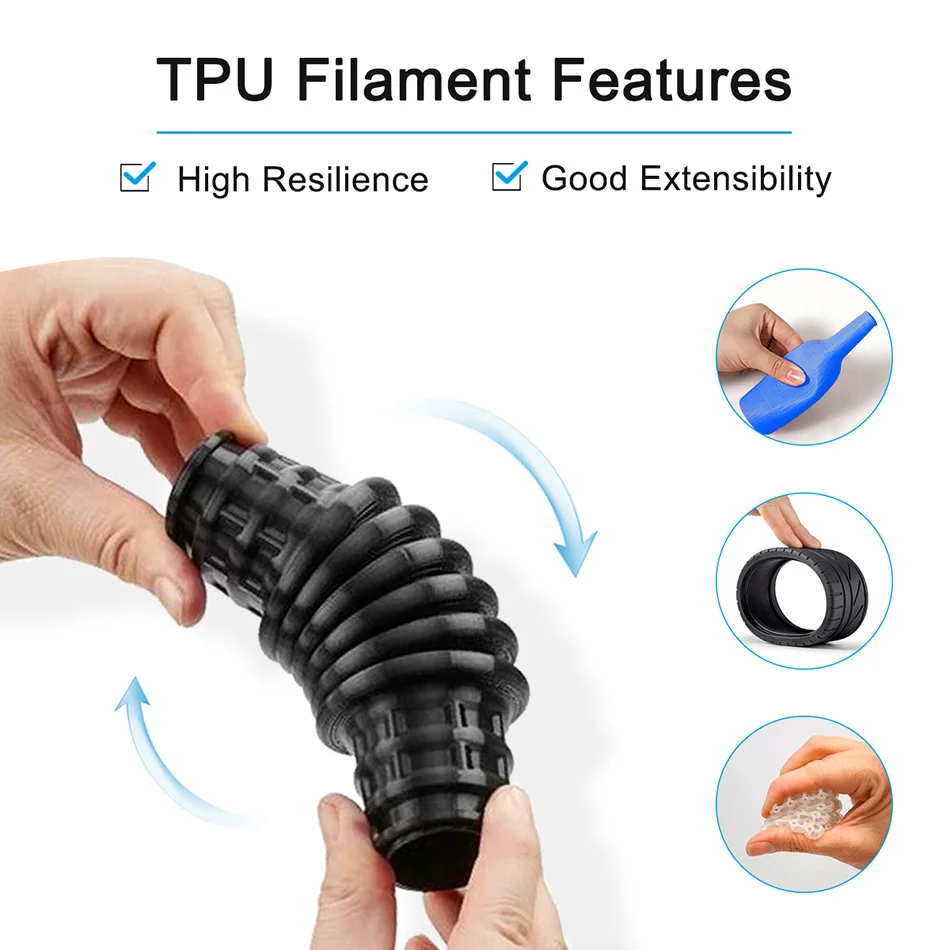 Гибкая нить из ТПУ не токсична, легко питается, легко формируется, обладает высокой прочностью и эластичностью. Хорошо для печати детских игрушек и обуви и т. Д.