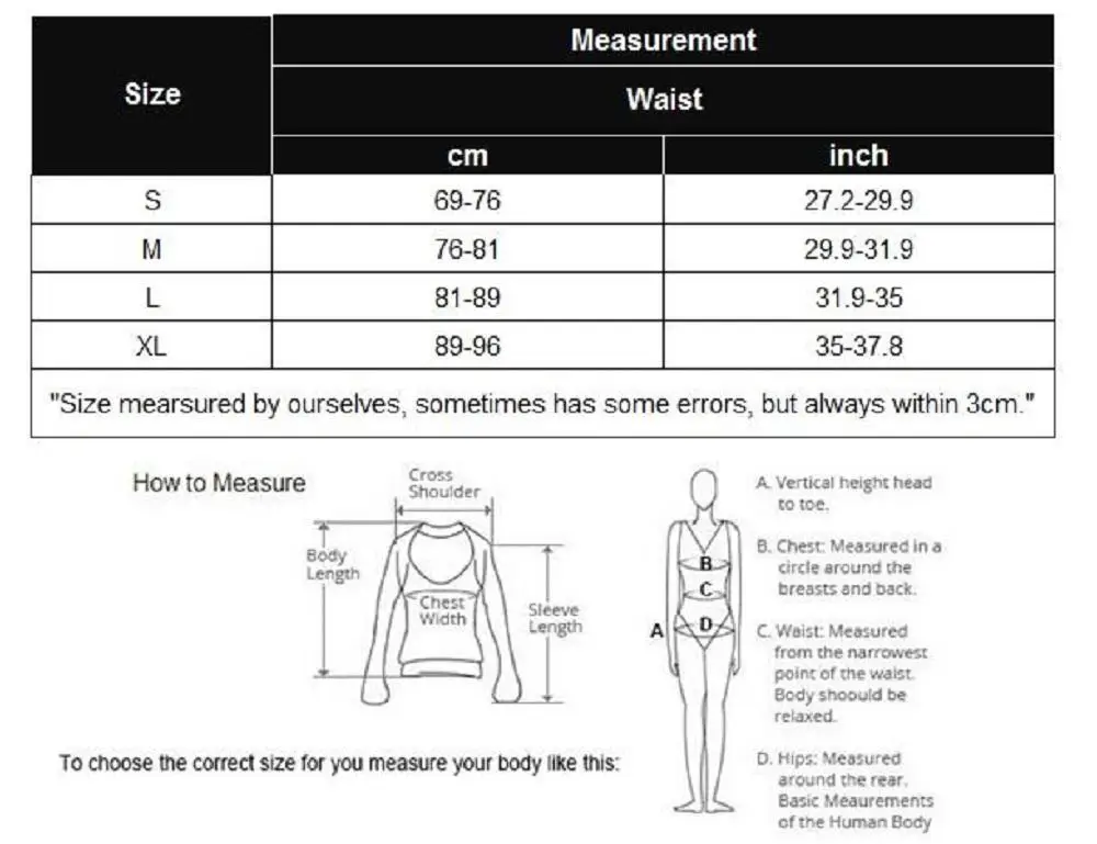 Waist S 69-76 cm 27.2-29.9 inch M 76-81 cm 29.9-31.9 inch L 81-89 cm 31.9-35 inch XL 89-96 cm 35-37.8 inch