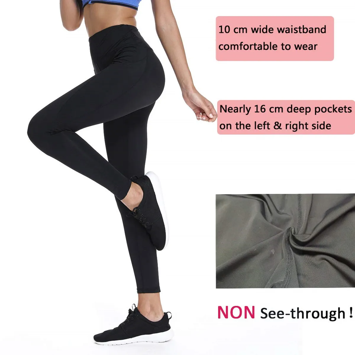 > Материал наших штанов для йоги с высокой талией и карманами достаточно плотный, что не просвечивает, если вы наклоняетесь, но не слишком толстый, что становится жарким и неудобным.