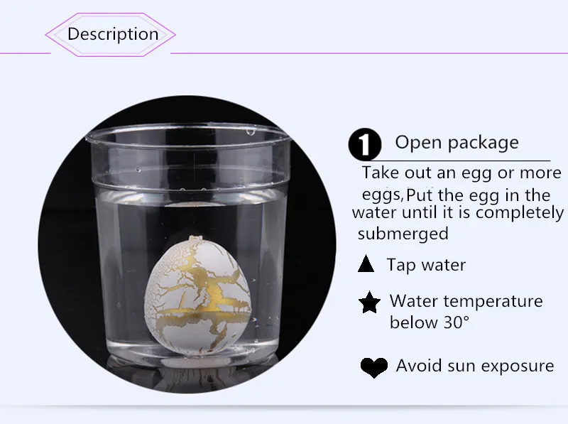 Описание: Эта игрушка с яйцами динозавра изготовлена из материала EVA, Нетоксичная, безвредная, безопасная для детей. В процессе инкубационных яиц, он может удовлетворить любопытство ребенка, культивировать их терпение и помочь им узнать процесс инкубации большинства животных. Такая новая и значимая игрушка, вашим детям понравится! Особенности: 1. Изготовлен из материала EVA, нетоксичный, безвредный, безопасный для детей. Корпус яркий и милый. 2. Новая игрушка. Замачивание яйца в воду в течение нескольких дней, игрушка динозавра прорвется через раковину, а затем постепенно вырастет. 3. Позвольте детям узнать процесс инкубации большинства животных, когда они играют с ним весело. 4. Может удовлетворить любопытство ребенка и культивировать его терпение в процессе инкубационных яиц. 5. Поставляется с 60 шт яиц в коробке и различными динозаврами, хорошо подходит для детских вечерние. Технические характеристики: Материал: ЭВА (этиленвинилацетат) Размер яйца: прибл. 3x2 см/1,2 "x 0,8" Количество: 1 коробка игрушек с яйцами динозавра Посылка включает в себя: 1x60 шт./кор. из Яйца Динозавра Игрушка Инструкции по уходу за изделием 1. Положите яйцо в контейнер и заполните водой, пока вода не закроет яйцо. Температура воды <30 °. 2. Яичная скорлупа разобьется через 12-24 часа медленно, затем ПЭТ прорвется через скорлупу. Не забывайте постоянно добавлять воду. 3. После того, как яичная скорлупа полностью разбита, пожалуйста, добавьте воду в контейнер, и ПЭТ будет продолжать расти через 24-48 часов. Вы можете перемещать питомца в новый и большой контейнер, чтобы смотреть, как он растет. Примечание: Цвет животного динозавра будет отправлен случайным образом, может не соответствовать цвету оболочки.