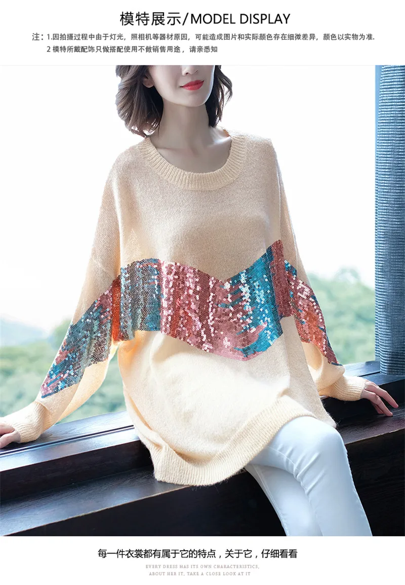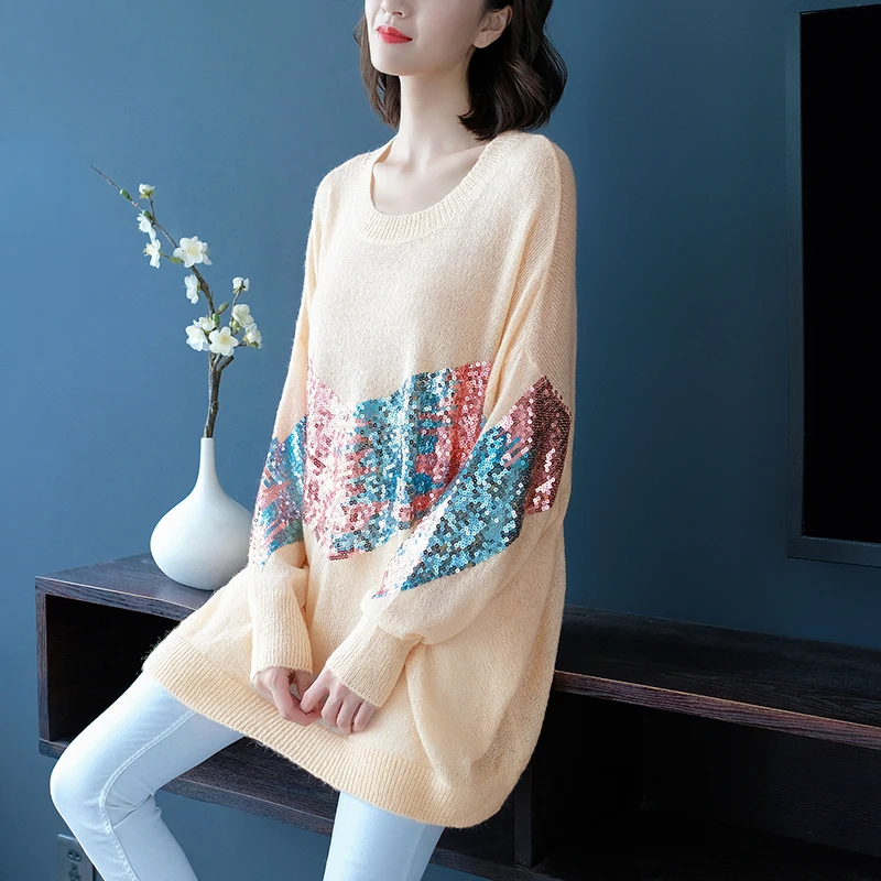 Отзывы о Женский свитер с длинным рукавом Свободный вязаный длинный пуловер блестками на