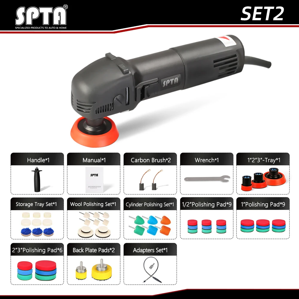 [Товар]: роторная полировальная машина [Бренд]: SPTA [Опорная пластина] :3 дюйма [Напряжение]:110 В/220 В [Входная мощность]:780 Вт до 1000 Вт [Скорость без нагрузки]:1000-5500 об/мин [Установка скорости]: 6 переменных скоростей [Функция]: Машинная депиляция, полировка и быстрая отделка [Комплект Вес]: 2,2 кг