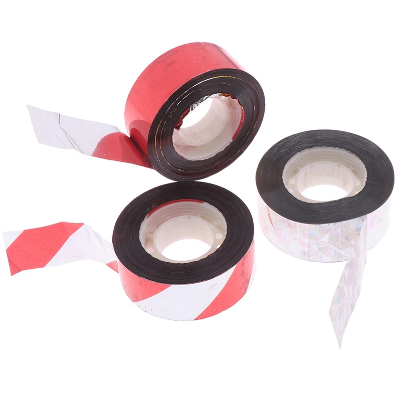 Изгоняющие ленты отпугивают птиц, отражая светильник. В чехол ветра, лента, также можем изготовить металлический звук, который помогает птица держаться подальше от области.