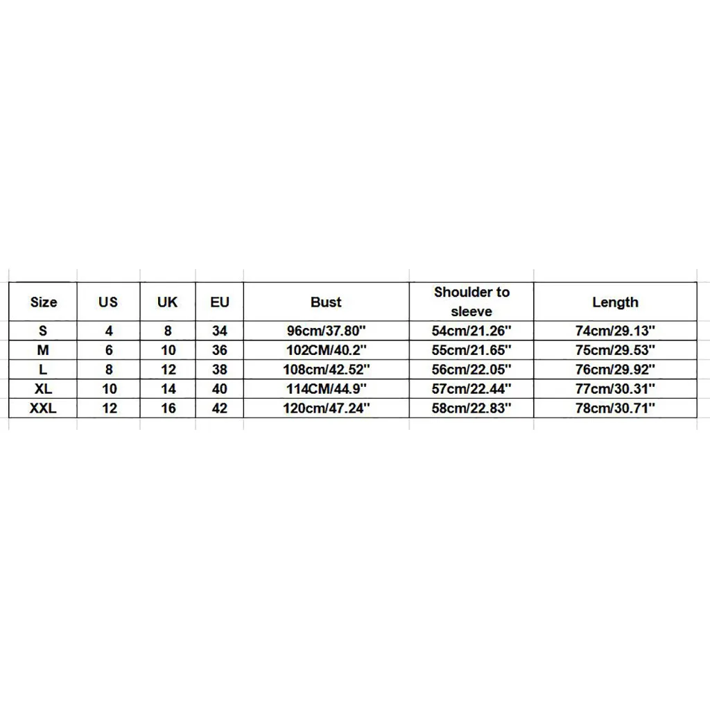 | Размер: XXL | США: 12 | Великобритания: 16 | ЕС: 42 | Обхват груди: 120 см/47,24 дюйма | От плеча до рукава: 58 см/22,83 дюйма | Длина: 78 см/30,71 дюйма |