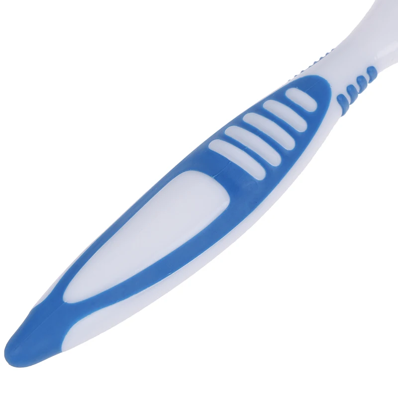 Двухцветная щетка для зубных протезов с большой контурной ручкой для лучшего захвата.