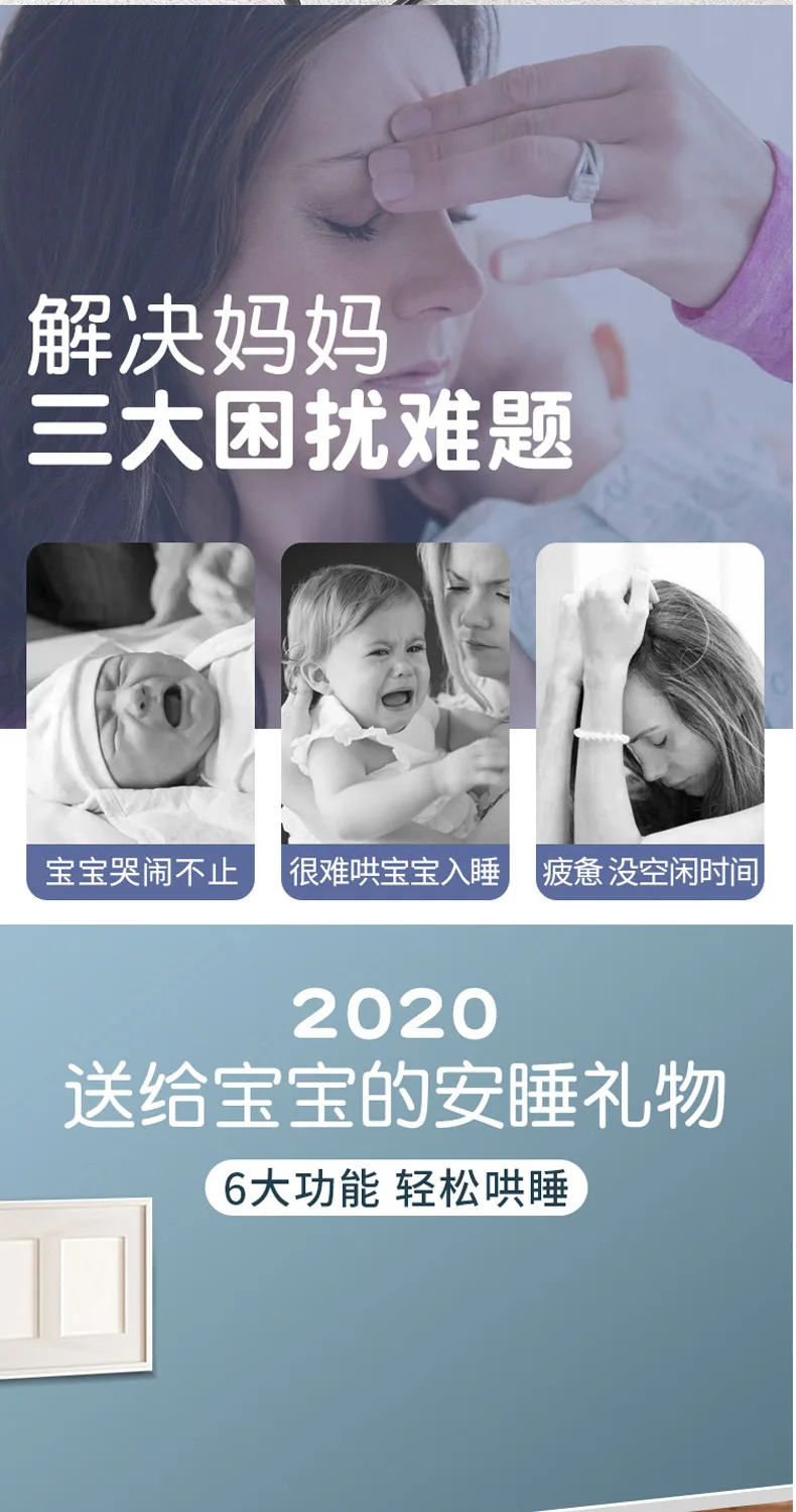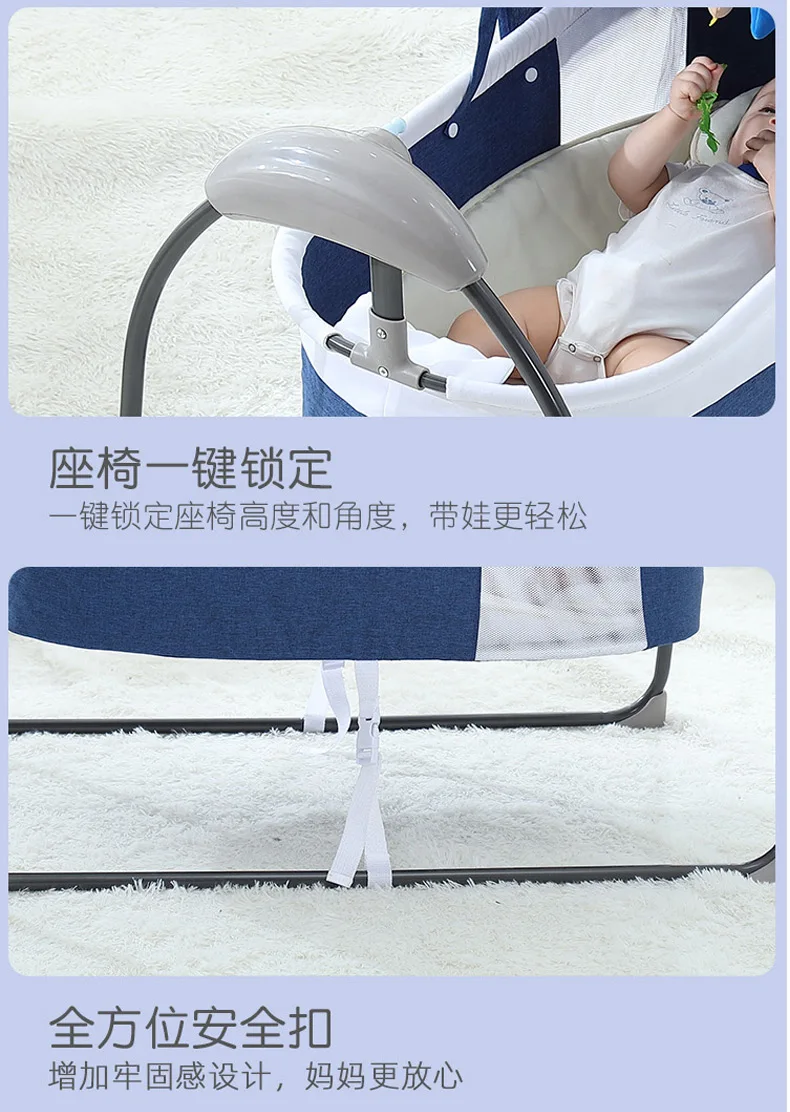 Описание продукта: Шейкер «Два в одном» 2. Микроконтроль компьютера 3. Экономия электроэнергии 4. Bluetooth музыка 5. Удлинить кровать 6. Подходящий возраст: от 0 до 3 лет 7. Умное управление, отпустите руки 8. Складное хранение, без места 9. Приятная для кожи ткань, впитывающая пот и дышащая, доступна во все сезоны 10 подшипников нагрузки: 20 кг 11. Размеры: 65*30*70 см