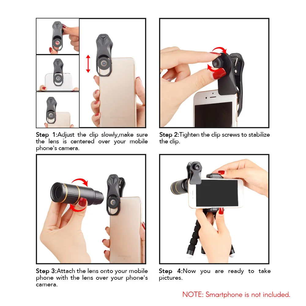 Объектив оптического телескопа 16X:Используйте технологию мобильного телефото, увеличьте свой мир, превратив ваше устройство в телескоп с увеличением 16x, приблизитесь, чем вы когда-либо были к своим предметам. Имеет удобное кольцо фокусировки, так что вы можете получить самые высокие результаты. Изготовлен из корпуса из алюминиевого сплава и многослойной стеклянной оптики, ABS зажим с слоем мягкой резины защищает ваш телефон от царапин и повреждений, прочный и надежный.