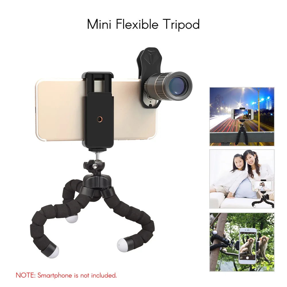 Поставляется с регулируемым держателем телефона для большинства смартфонов и мини-гибким штативом для держателя телефона.