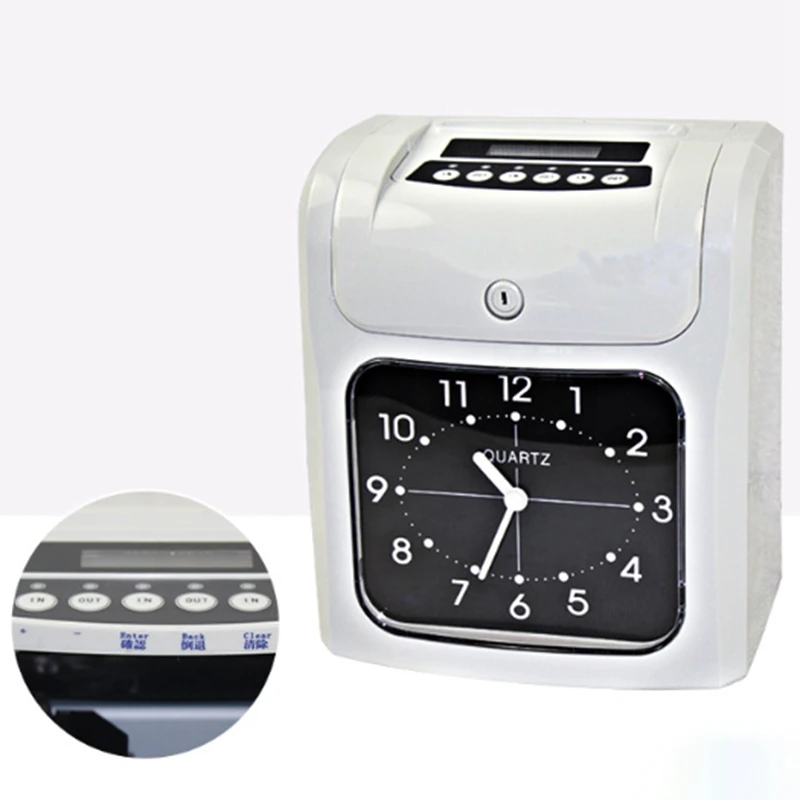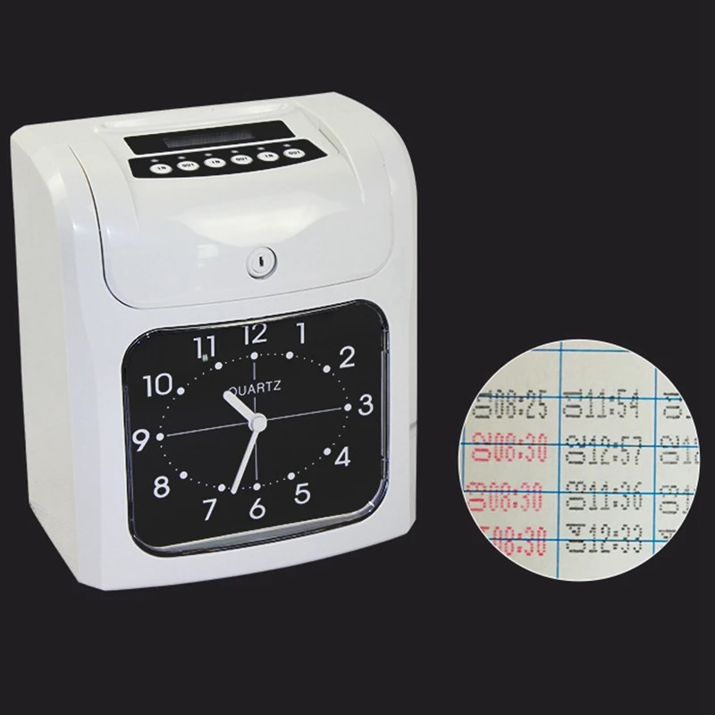 Два цвета печати, черный цвет означает регулярную посещаемость, в то время как хорошо отмеченный красный цвет показывает ненормальную посещаемость. с 2 отверстиями на задней стороне для настенного монтажа, и его также можно разместить на столе стабильно использовать. оснащен динамиками для воспроизведения музыкального тона, а также вы можете подключить к нему внешний звонок для уведомления сотрудников о времени начала и времени окончания.