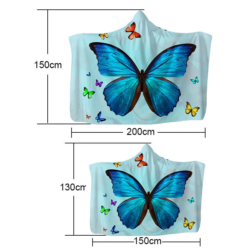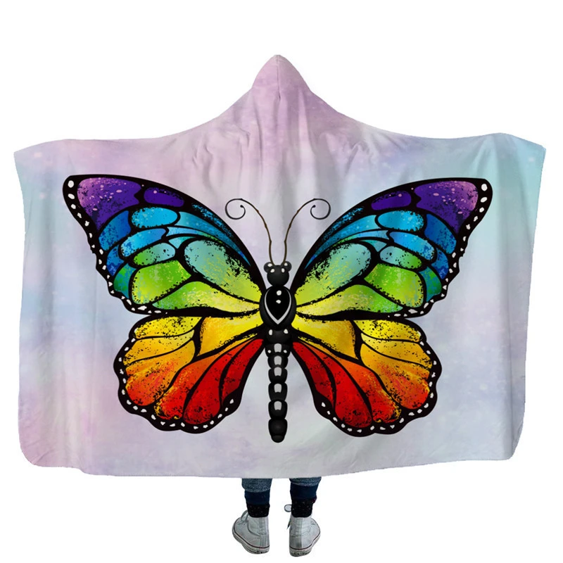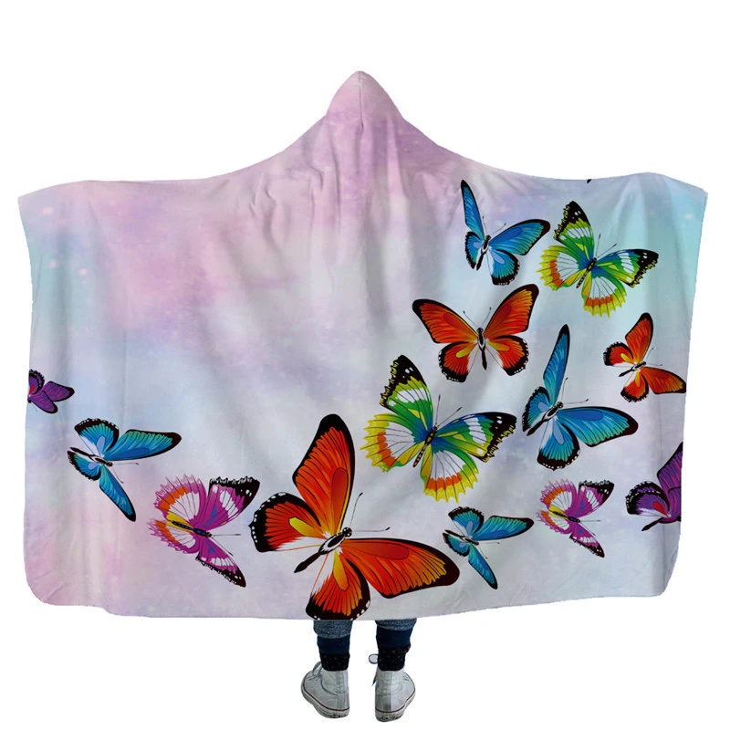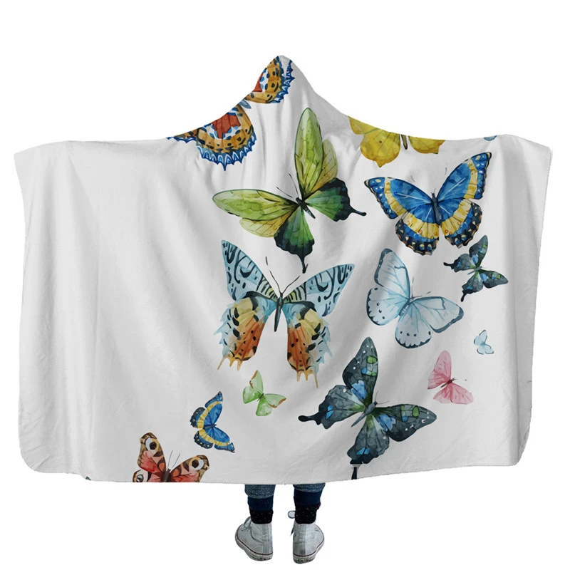 Детское мягкое теплое Флисовое одеяло с капюшоном для взрослых, цветной принт с бабочкой, удобный конверт с капюшоном, зимняя домашняя накидка, одеяло s