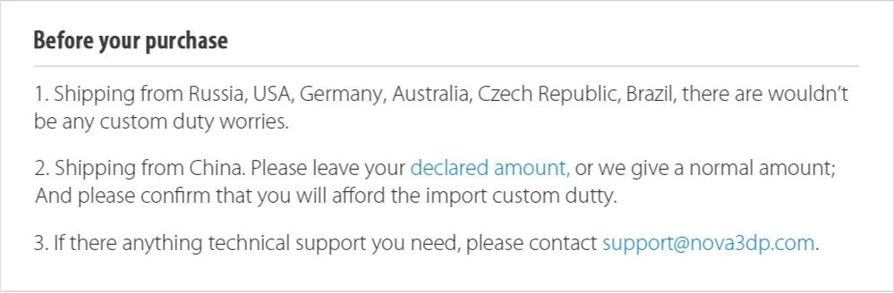 1. Бесплатная доставка по всему миру или нет? Ответ: это не глобальная бесплатная доставка. Из-за разного стандарта зарядки курьерской компании в разных странах Мы предоставляем бесплатную доставку в некоторые страны. 2. Почему мне нужно платить гонорары за удаленную область? Ответ: из-за курьерской компании (dhl, fedex, ups, TNT, ems и т. Д.) делят различные области, как отдаленные области на основе их стандарта. Таким образом, мы не знаем, является ли ваш адрес удаленной областью, прежде чем мы получим информацию о вашем адресе. Поэтому, если ваш адрес является удаленной областью, нужно оплатить плату за удаленную область. 3. Почему мой заказ всегда не имеет подробной информации об отслеживании? Ответ: после того, как вы закончите оплату, нам нужно 1-3 дня обрабатывать заказ, затем отправить в курьерскую компанию. Экспресс-компании нужно проверить и записывать, а затем организовать доставку. Как правило, необходимо 3-5 дней обновлять информацию для отслеживания. Если нет информации в течение 7-10 дней. Пожалуйста, свяжитесь со службой поддержки покупателей. 4. Сколько дней я получу свой принтер? Ответ: как правило, после обновления первой информации об отслеживании требуется 5-10 дней. 5. Почему мне нужно платить налог для нашей местной экспресс-доставки или для местной таможни? Ответ: если ваша местная курьерская компания взимает ваши деньги, пожалуйста, спросите их, почему взимается плата. И из-за чего? Это очень важно для покупателя. О таможенных пошлинах. Ни один орган не может контролировать, таможня каждой страны имеет различную систему импортных и экспортных пошлин.