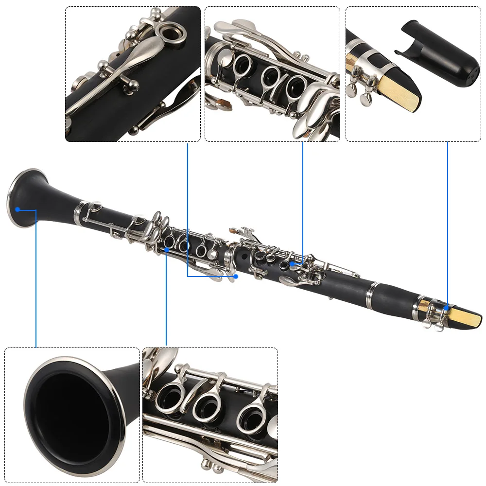 Изготовлен из АБС-пластика,Bb кларнет с 17 клавишами.