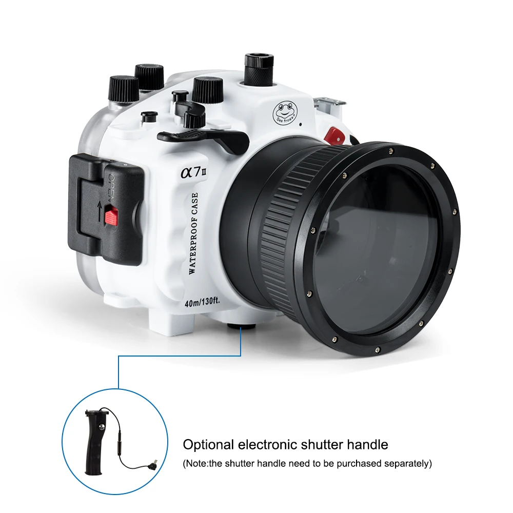 Подводный Корпус для Sony A7 II (белый) Стандартный плоский порт В виде пистолетной рукояткой с 2-х стадийной триггер Зум-передача для объектива 28-70 мм Руководство пользователя Запасное кольцо O'ring Плечевой и наручный ремень