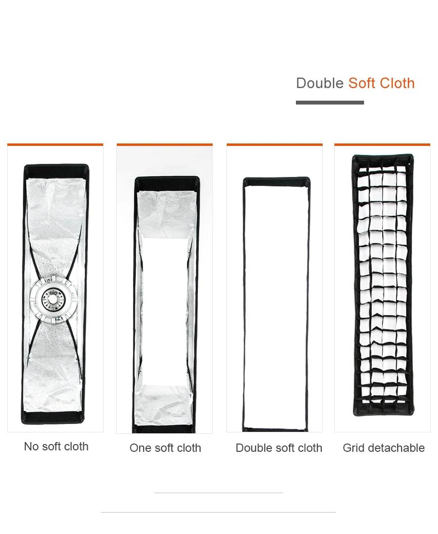 Посылка включает: Софтбокс x 1. Металлическое Монтажное кольцо x 1 Металлический опорный полюс x 4 Внутренняя мягкая ткань x 1 Grid1 Передняя крышка x 1