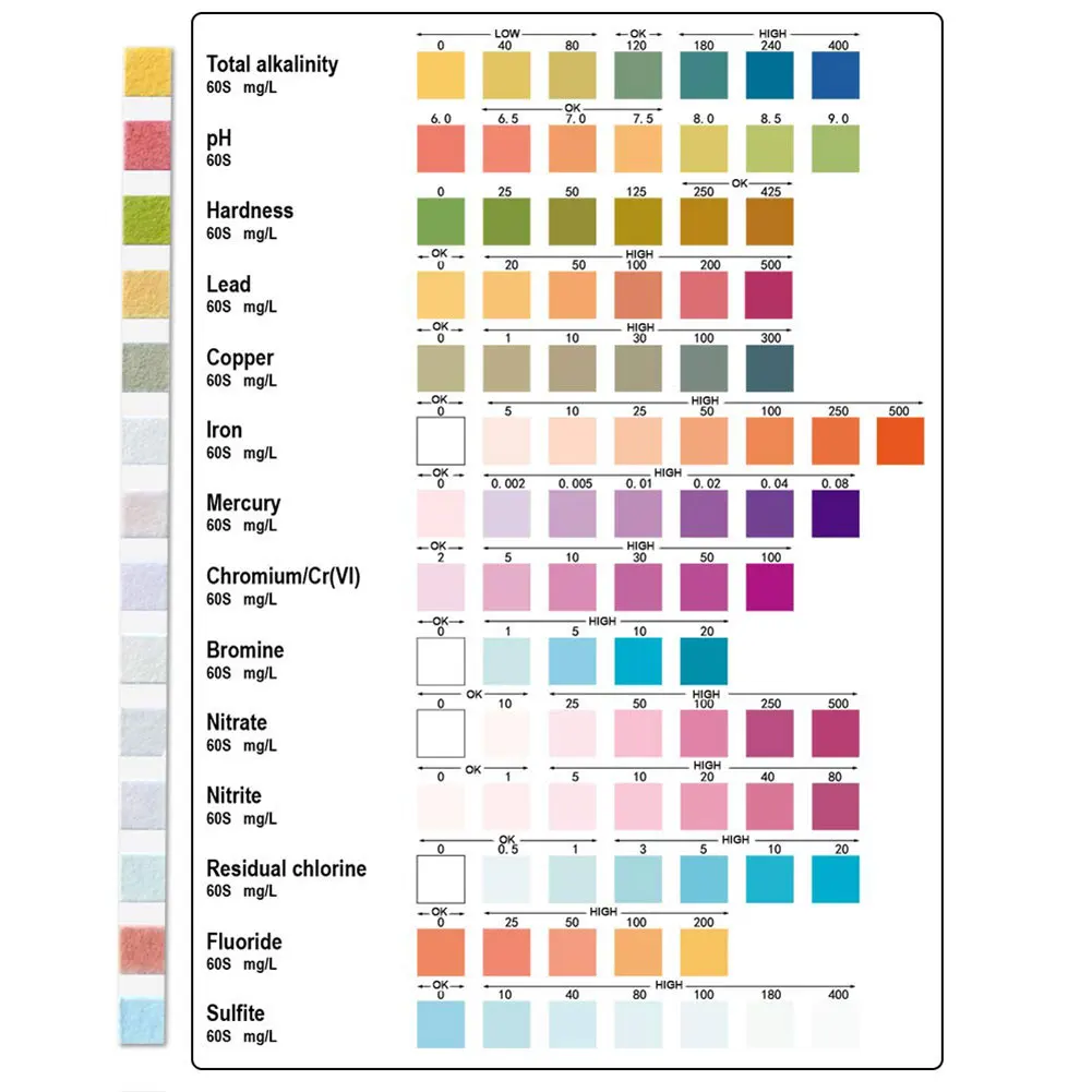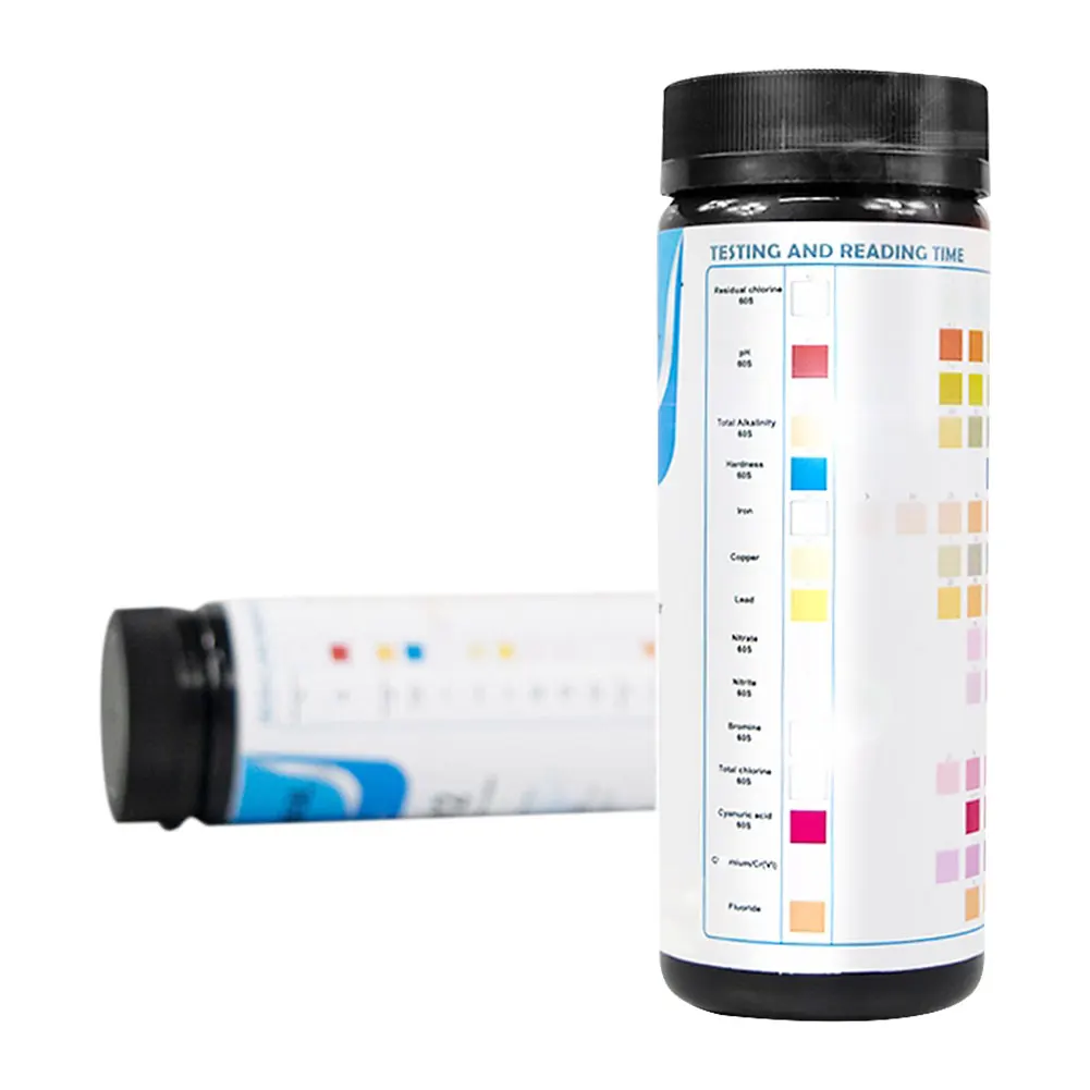 【Один тест для 14 параметров 】 Анализ 14 химических факторов качества воды: общий хлор, свободный хлор/Бром, pH, общая Щелочность, нитраит, нитрит, общая твердость, железо, медь, свинец, фторид, остаточный хлоринеат, бром, общий хлор, Cr, цианурная кислота один раз.