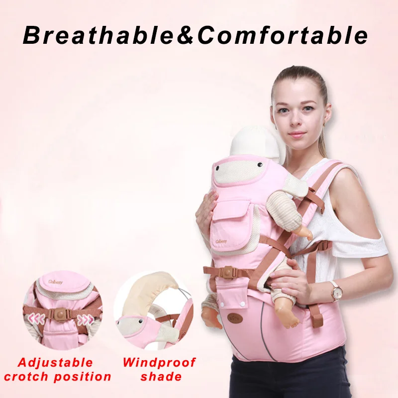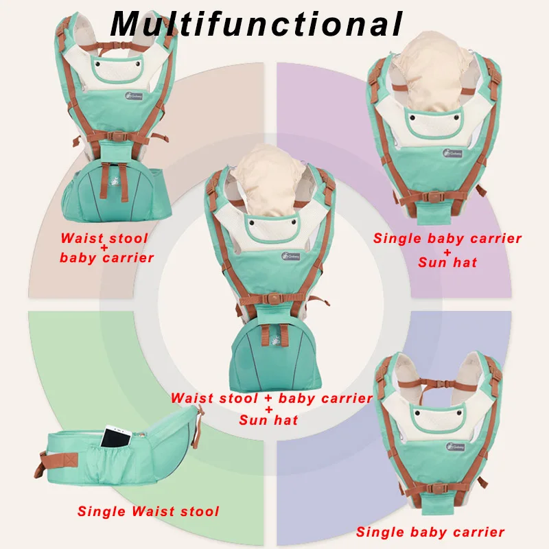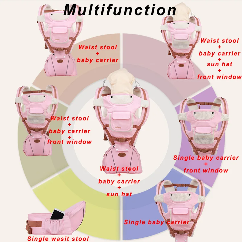 Descritption: 1.Fabric: face cloth cotton, lining polyester 2.Waist circumference: 65-115cm Function: 1. Multi-functional model:single hip seat model ,combine model 2. Suitable for 0-36 month. 3 year , one carrier ! 3. more than 15 kinds of carry way for 0-36 months 4. With a large capacity storage 5. With a long back panel can protect baby from wind and sun 6. Long back panel can also protect baby's spine 7. Scientific cushion design to prevent baby O-legs 8. Suitable for summer and 4 season 9. Lovely color for baby boy and girl