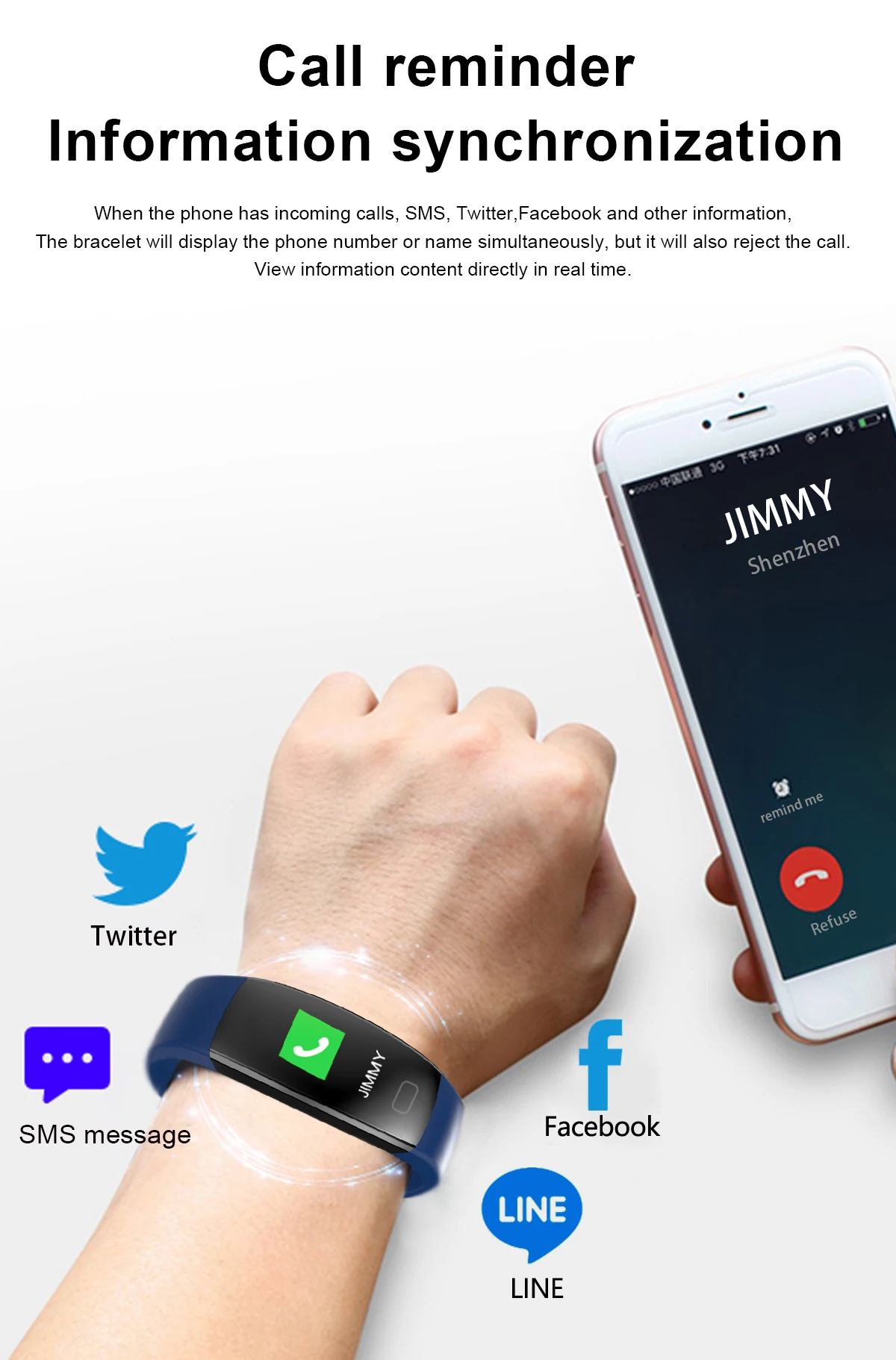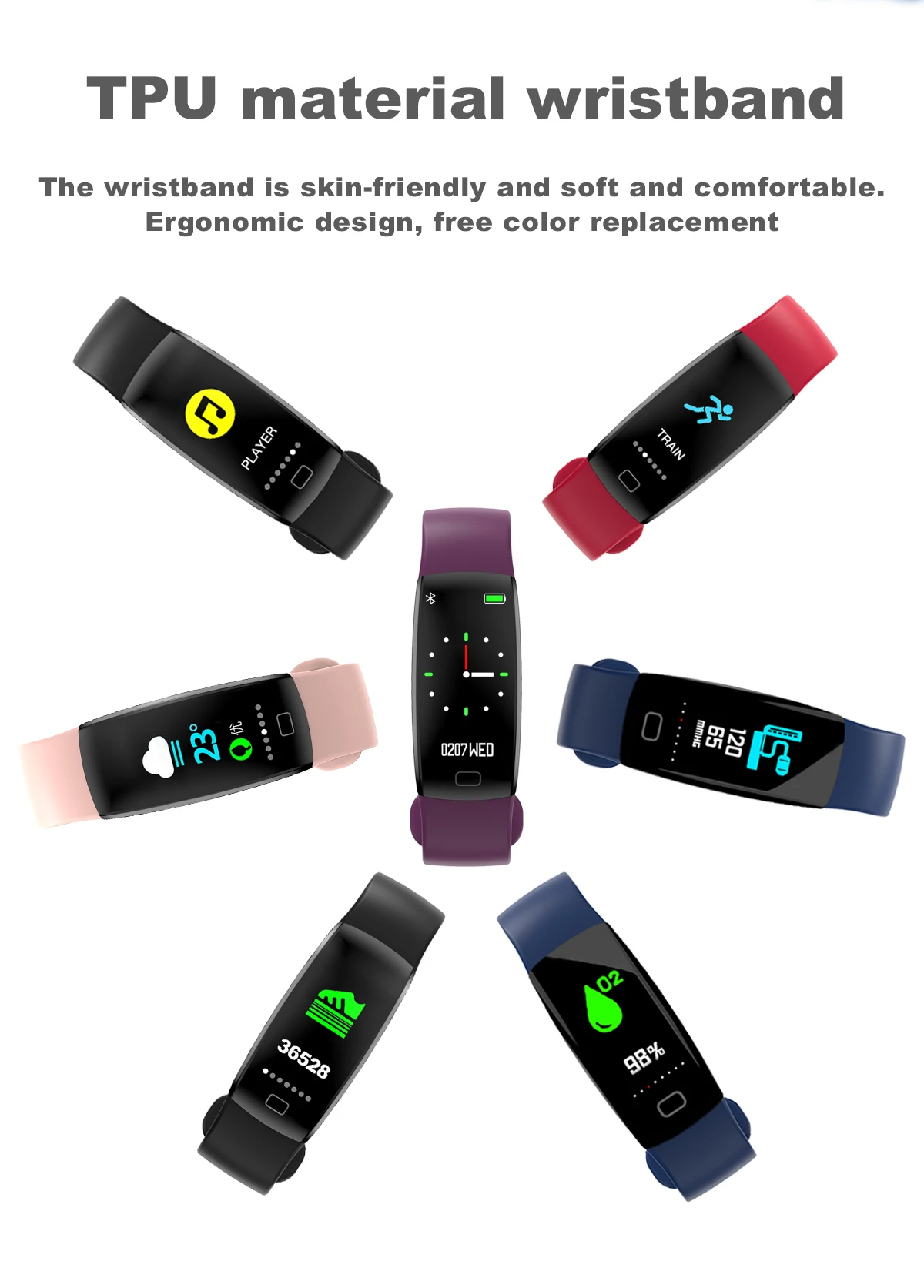 Особенности: * 0,96 дюймов 80*160 dpi TFT емкостный сенсорный экран * IP68 Водонепроницаемый * Встроенный литий-полимерный аккумулятор 90 мАч, время зарядки около 2 часов, время работы в режиме ожидания около 7-10 дней * Напоминание о звонке (имя звонящего/идентификатор звонящего) * Bluetooth Push: поддержка (звонящий, SMS мессенджер, напоминания о новостях приложения) * Поддержка определения пульса артериального давления кислорода в крови * Шагомер: поддержка (шаг упражнений, расход калорий, запись пробега движения) * BLE 4,0, Поддержка iOS 9,0 и Android 4,4 или выше * Дополнительные функции: монитор сна, напоминание о тревоге, анти-потеря, пульт дистанционного управления камерой, дистанционное управление музыкой, прогноз погоды, поиск браслета и т. д.