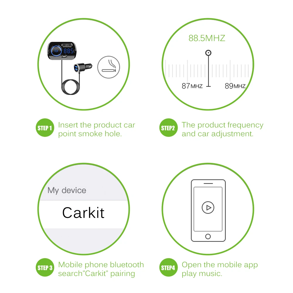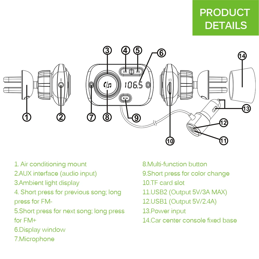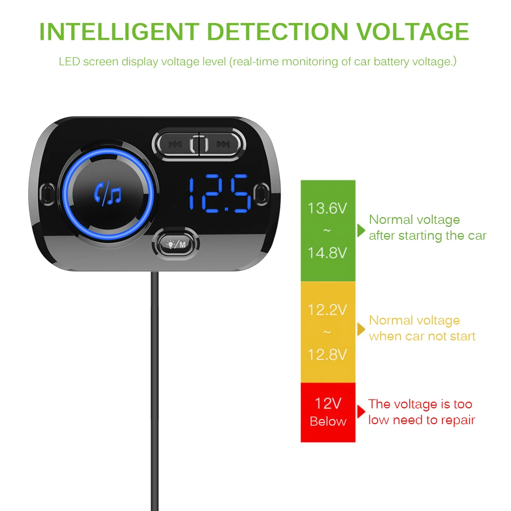 Поддержка громкой связи, безопасное вождение. С кнопками на fm-передатчике Bluetooth вы можете легко управлять звонком, музыкой, громкостью, частотой и режимом воспроизведения. Воспроизведение памяти выключено, передатчик будет продолжать воспроизводить с разбитой песни, когда он включится