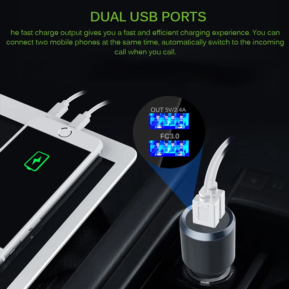 Два usb-порта позволяют слушать музыку во время зарядки. Выход быстрой зарядки дает вам быстрый и эффективный опыт зарядки. Вы можете подключить два мобильных телефона одновременно, автоматически переключаться на входящий вызов при звонке