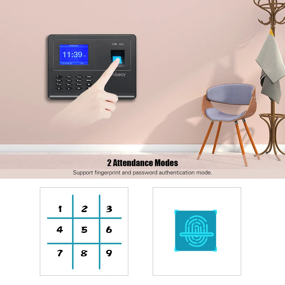 2 режима посещаемости-Поддержка Режима аутентификации отпечатков пальцев и паролей. Использование высокоточного оптического коллектора с полным отражением отпечатков пальцев, точная идентификация на 360 градусов влажных и сухих пальцев.