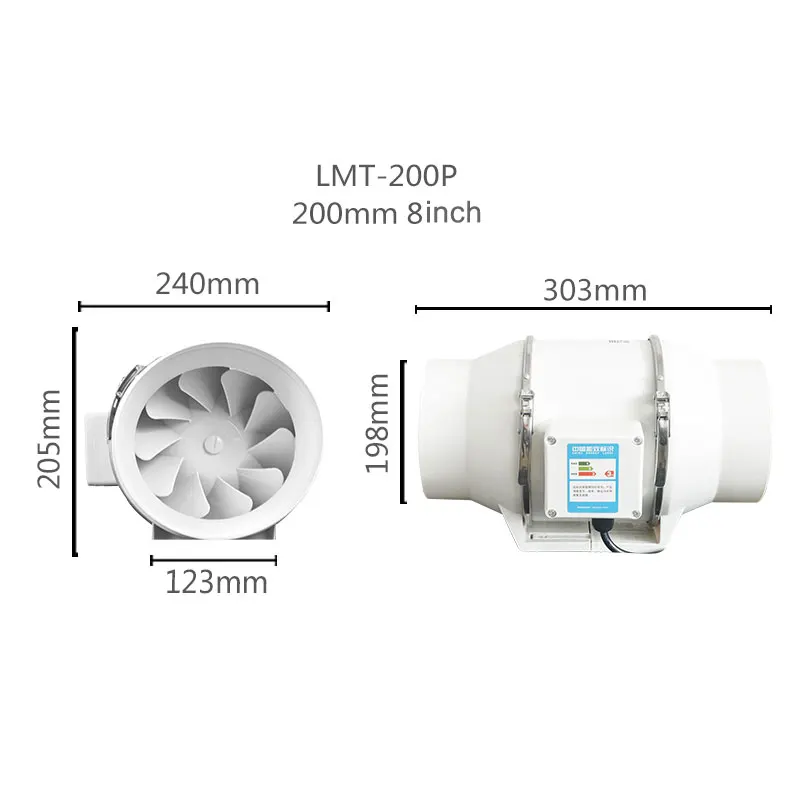 -Размер воздуховода: 8'' -Напряжение: 120 В/230 В/60 Гц -Скорость ветра (mmph 3;/ч): 220-1800 -Входная мощность: 45 Вт -1,5 M EU/US/AU/JP-вилка силовой линии
