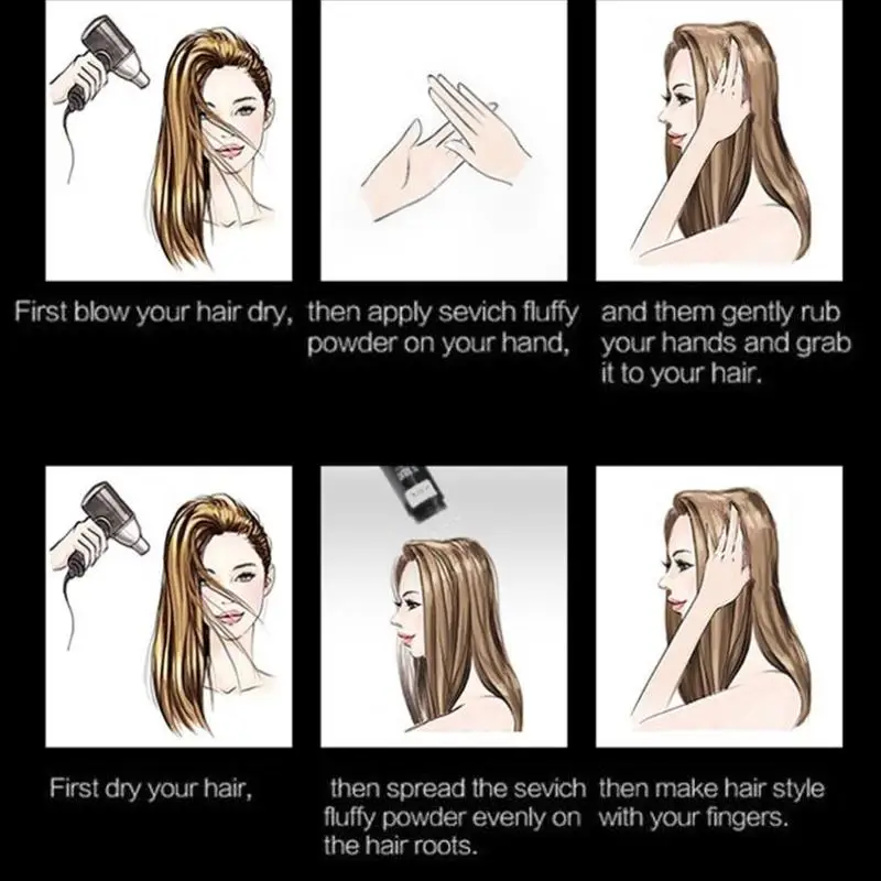 Как использовать: 1. После того, как волосы высушены, Налейте пушистый порошок на руки, аккуратно протрите руки и захватите волосы и захватите слой. Эта техника подходит для использования в конце волоса.