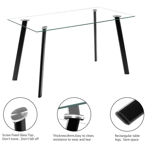 Этот обеденный стол позволяет 6 человек комфортно сидеть, который подходит для кухни, столовой, кафе и домов. Прочная металлическая конструкция и высококачественное закаленное стекло 8 мм обеспечивают безопасность и срок службы стола. Тщательные скругленные углы предназначены для обеспечения безопасности продукта. Простая структура рамы и гладкая поверхность делают вашу очистку проще. Пятна на столе могут быть быстро очищены, что уменьшает ваше беспокойство. Обеденный стол из закаленного стекла не подвержен воздействию воздуха в помещении и не деформируется из-за неправильной влажности. Кроме того, он является здоровым, экологически чистым и не имеет радиации.
