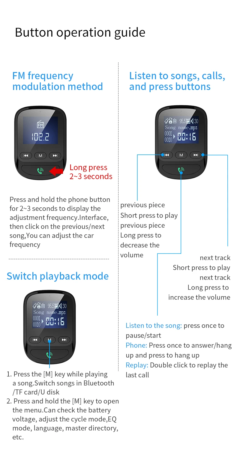 ● Car Bluetooth FM transmitter: Transfer music from mobile phone, U disk, TF card and MP3 to car audio player.