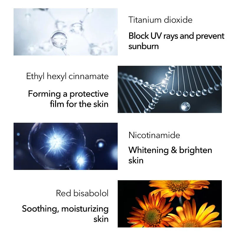 Основные ингредиенты:Диоксид титана, метоксицинковая кислота, этилгексил эфир, никотиam, бисаболол и т. Д.