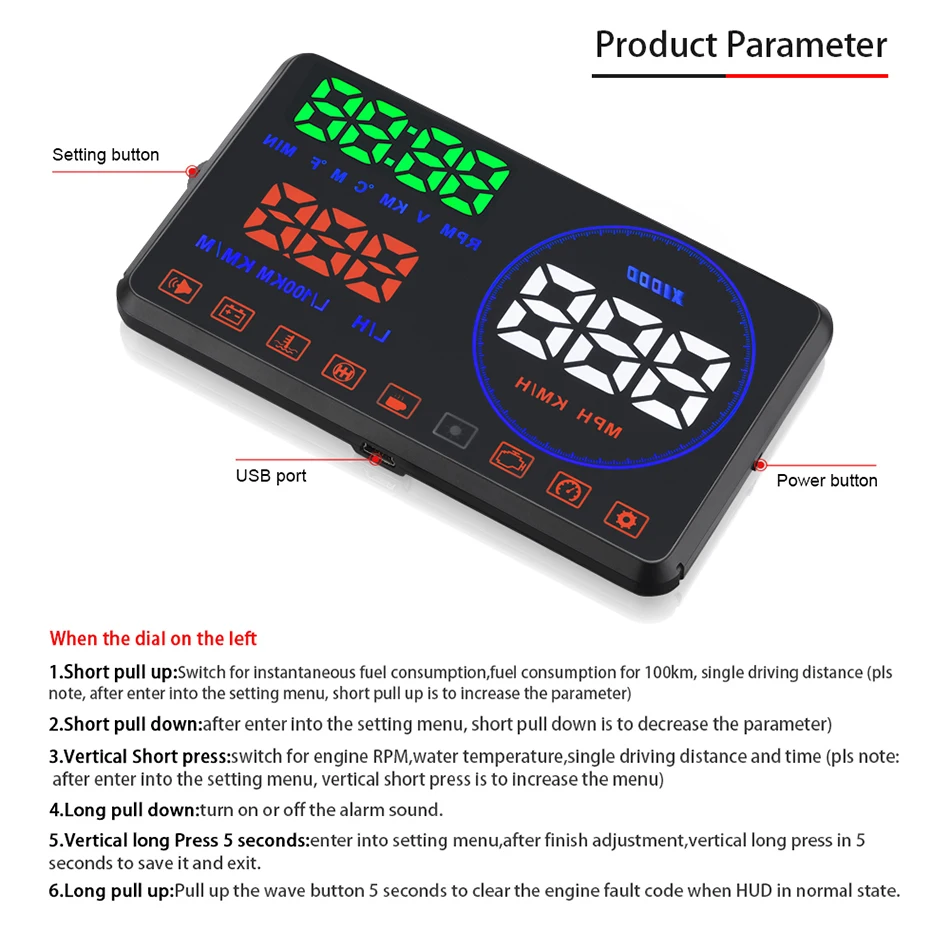 Основная функция Информация о дисплее: скорость путешествия температура резервуара для воды напряжение батареи скорость двигателя мгновенный расход топлива 100 км мгновенный расход топлива количество пройденных километров на этот раз время путешествия Обнаружение кода ошибки устранение кода ошибки Будильник: сигнализация с повышенной скоростью, сигнализация с температурой воды, оповещение о смене напряжения, напоминание о усталости вождения Пункт продажи товара 1.5.5-дюймовый цветной экран отражающие показания неразрушающая установка Plug and play 2. Более практичные данные о вождении: скорость вождения двигателя мгновенное потребление топлива 100 км мгновенное потребление топлива по местному времени количество пройденных километров может обнаружить и очистить Код диагностики ошибки автомобиля не требуется профессиональное оборудование 3. Слишком высокая температура воды, слишком низкое напряжение и т. д. 4. Начните с сна автомобиля с автомобилем эффективно защищает автомобильный аккумулятор, сохраняя при этом ручной выключатель машины более выгодным для управления HUD Параметры продукта 1. Температура окружающей среды: -40c - + 80c атмосферное давление 86-106KPa 2. Относительная влажность: 10%-95% шума окружающей среды <= 60 дБ (A) 3, Уровень звукового сигнала: "= 30 дБ (A) 4. Рабочее напряжение: 9 В ~ 16 В постоянного тока (12 В постоянного тока/400 мА) 5, размер продукта: 12,5*7,5*1,5 (см) 6, вес изделия: 110 грамм Сертификация продукта: CE ROHS FCC Аксессуары: 1 * mainframe, 1 * OBD line, 1 * Противоскользящий коврик, 1 * светоотражающая пленка, 1 * Руководство пользователя Подходящие модели OBD2 Применимый объем: OBD2 протокол бензиновый автомобиль, произведенный Отделом США после 2004 года, OBD2 соглашение бензиновый автомобиль, произведенный в других регионах после 2008 года OBD2 HUD не подходит для следующих общих моделей: Models модели OBD2 не могут быть использованы в США: Dodge, JEEP, Sail, Chrysler, модели, произведенные до 2004 и 2004 ▲ OBD2 все легальные системы, итальянские модели не могут быть использованы: такие как: Fiat, Maserati, Lamborghini, DS, логотип, Citroen, Renault, Simka, Amirka и так далее. Japanese японские модели OBD2 не могут использоваться: Suzuki, Mazda 6, Infiniti (QX50 q50 q501), Toyota avanza 2013, Lexus (is250, ex250, ES300H) Honda (jazz, CRV) И автомобилей, произведенных до 2008 года. Kia Южная Корея Kia и современные модели не могут использовать модели OBD (2013 Hyundai Sonata, 2017 Kia Soul PS и т. Д.) Гибриды с дизельными и электрическими автомобилями, пикапами, RVs, модифицированными машинными компьютерами и HUD не используются. Рекомендуется использовать модели GPS.